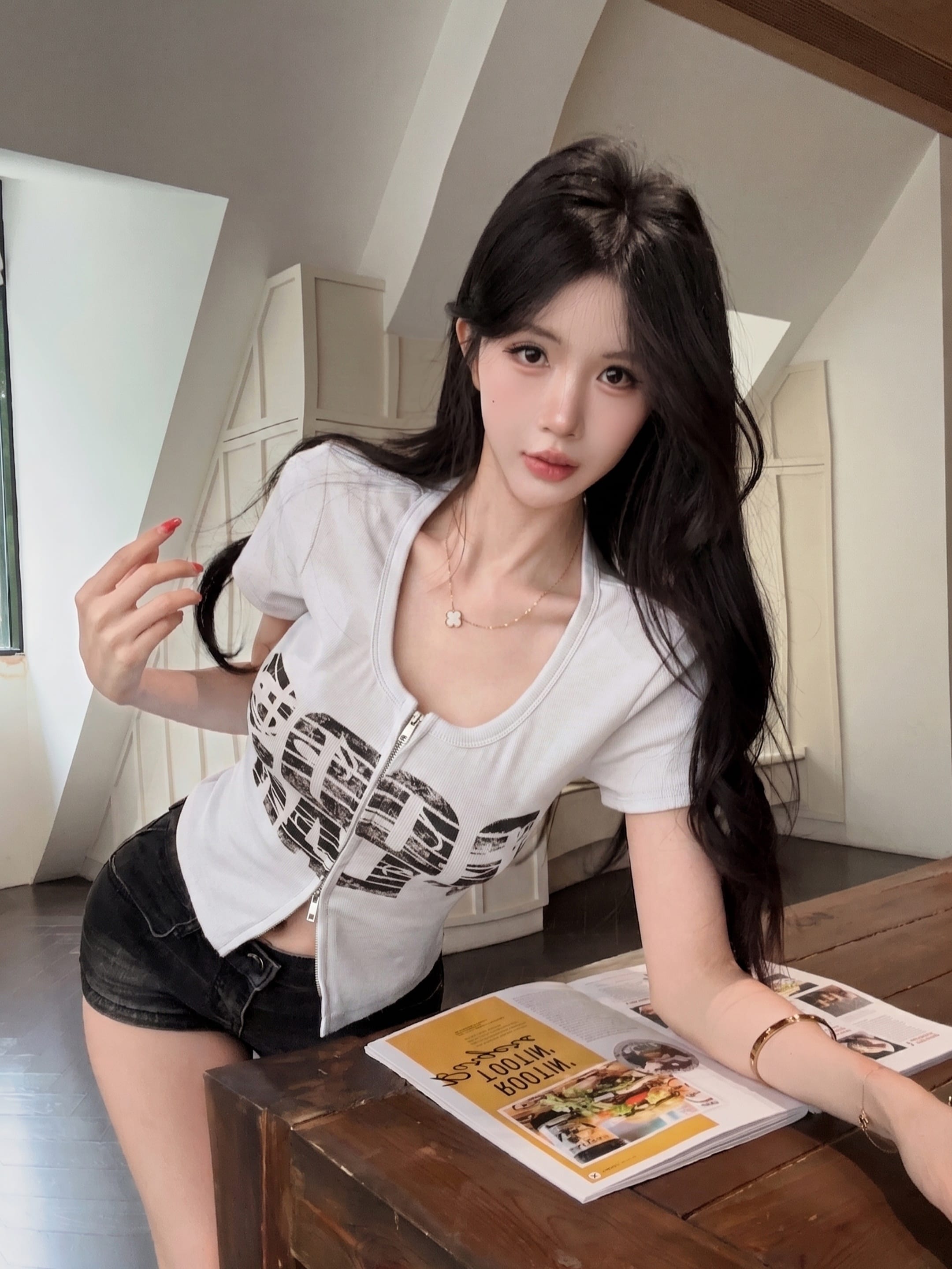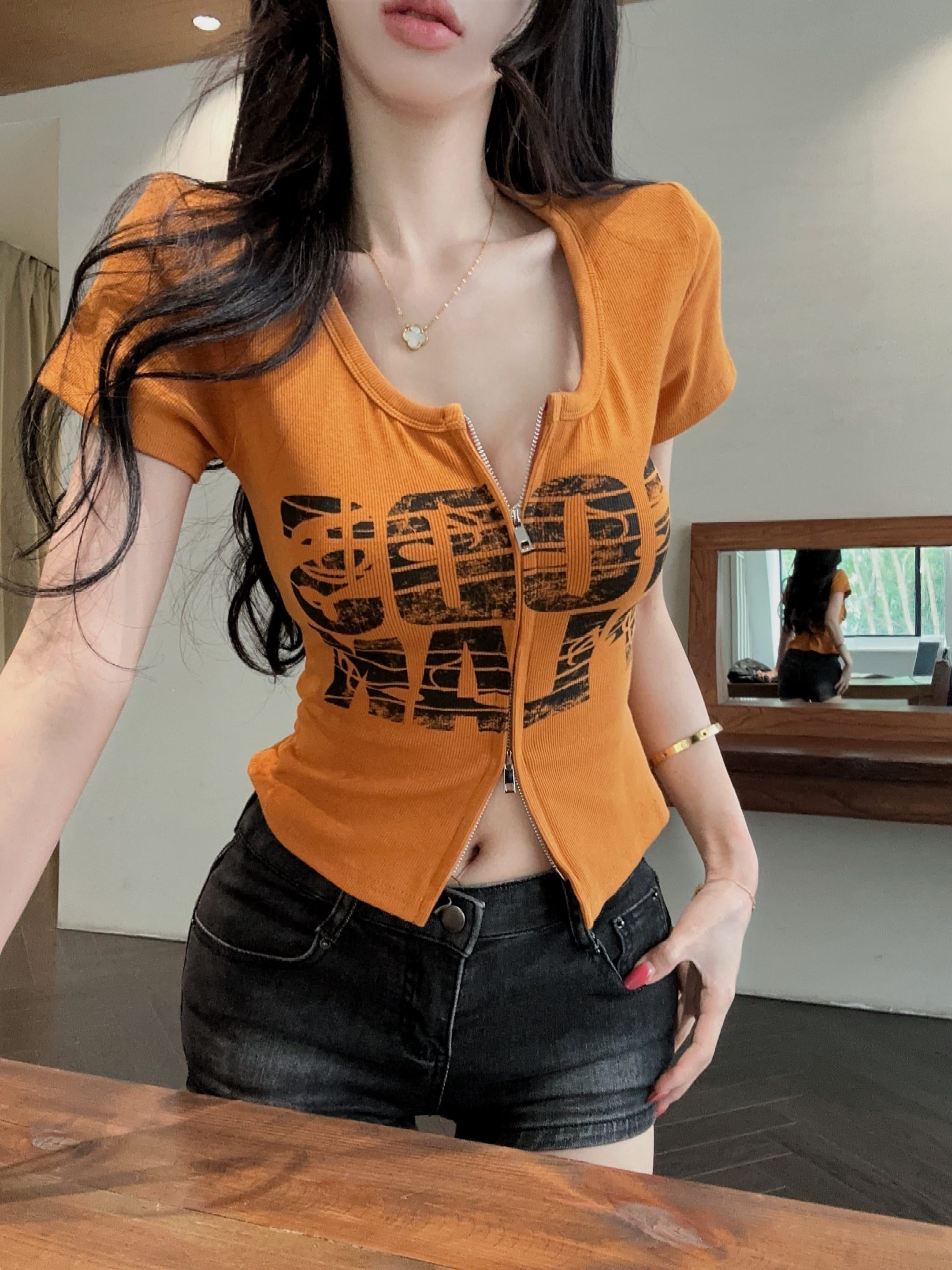 실사 정가 디자인 센스 어깨 패드 알파벳 프린트 몸매 가꾸기 슬림해 보이는 쇼트 스타일 티셔츠 여성 더블 머리 지퍼 오픈 가디건 맨위