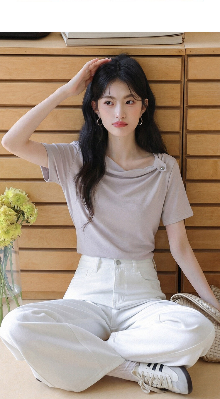 오프숄더 반팔 여성 티셔츠 여름 2026 새로운 불규칙 디자인 센스 작은 대중 몸매 가꾸기 슬림해 보이는 비스듬한 어깨 의류