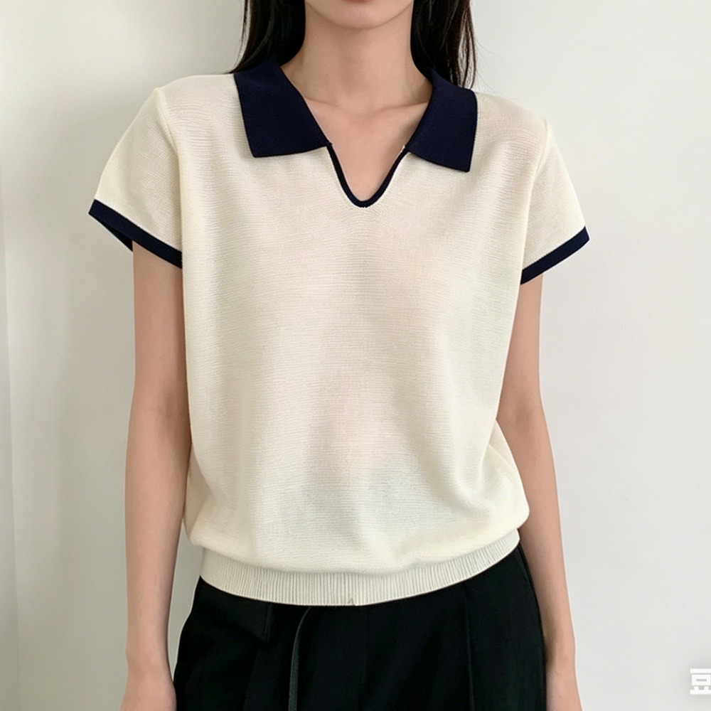 실사 한 부서 학원 스타일 단색 작은 v 폴로 칼라 높음 질감 니트 티셔츠 반팔 2026 여름 반소매 맨위