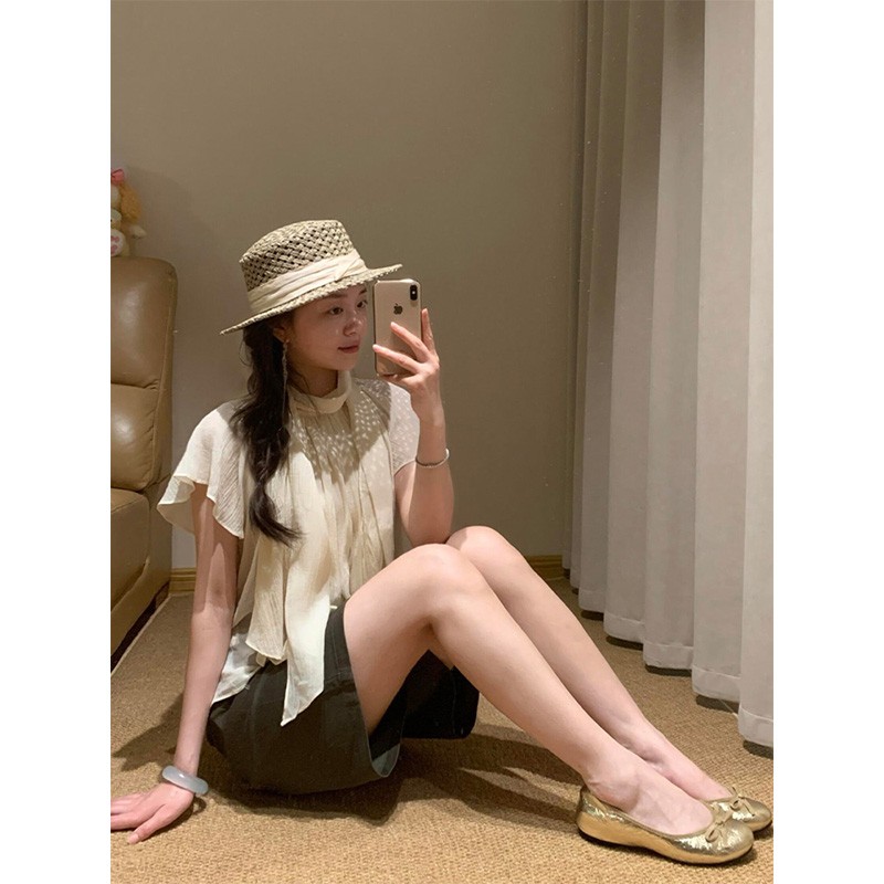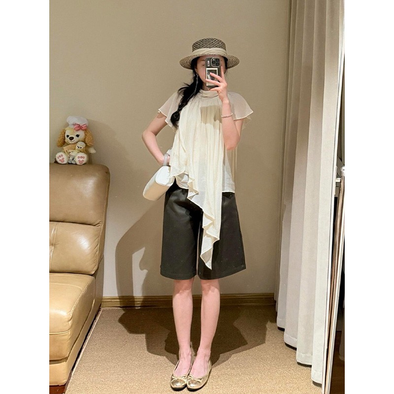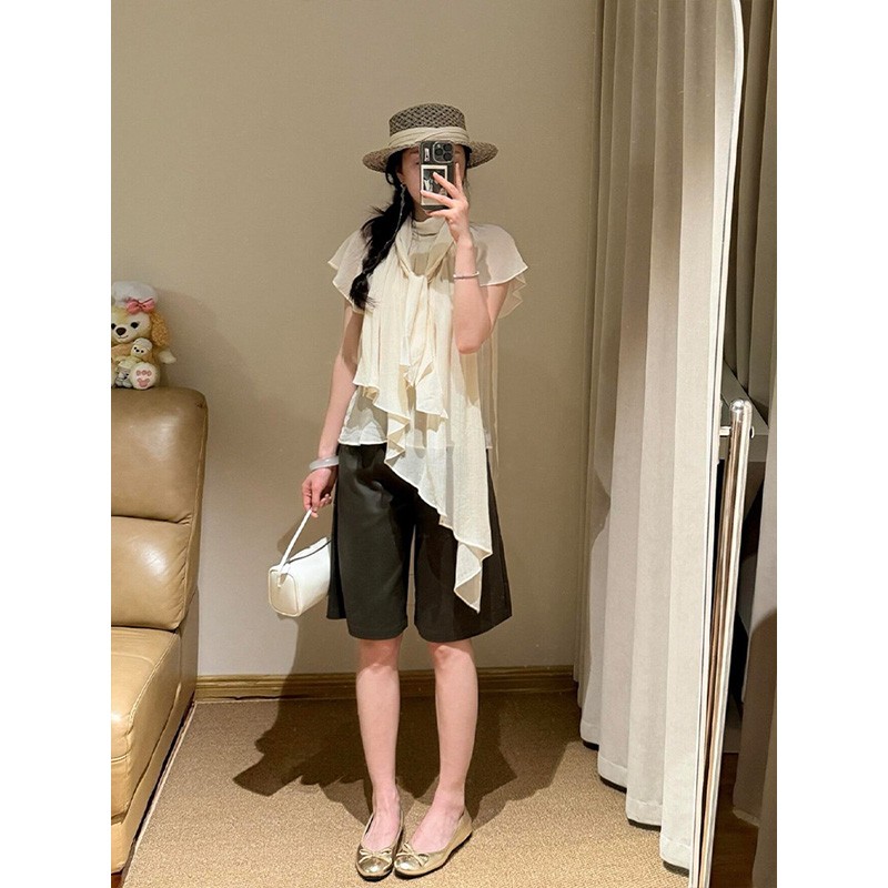 정가 재고 있음 한 부서 캐주얼 바람이 아닙니다. 규칙 리본 반팔 셔츠 하이웨이스트 슬림해 보이는 넓은 다리가 짧다. 바지 세트