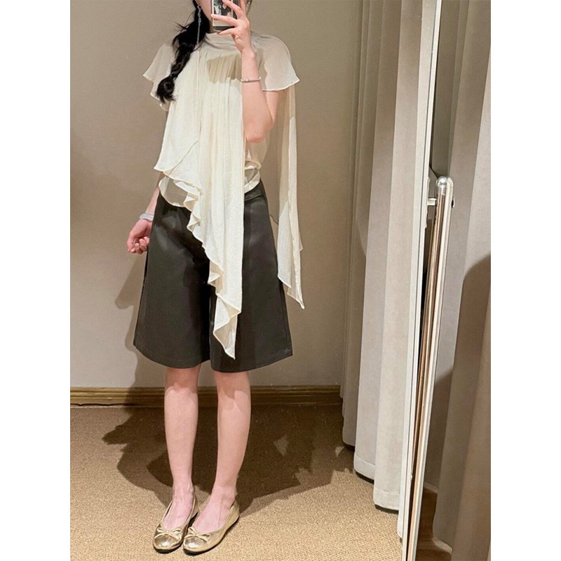 출퇴근 바람 회색 폴로 칼라 십자가 디자인 5 점 소매 여성 셔츠 2026 여름 새로운 불규칙 싱글 착용 맨위