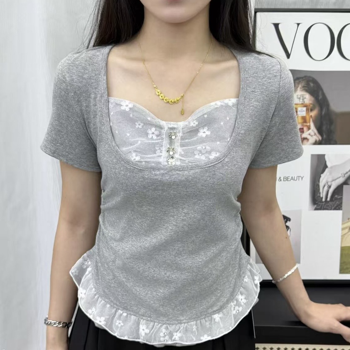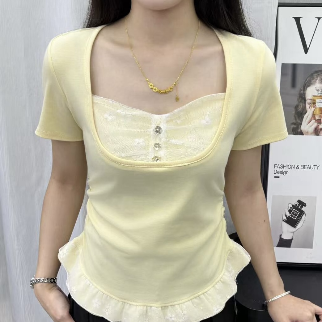 광장 칼라 레이스 조각 긍정적 인 어깨 반팔 티셔츠 여성 여름 몸매 가꾸기 타이트 허리 수축 쇼트 스타일 불규칙 패션 맨위