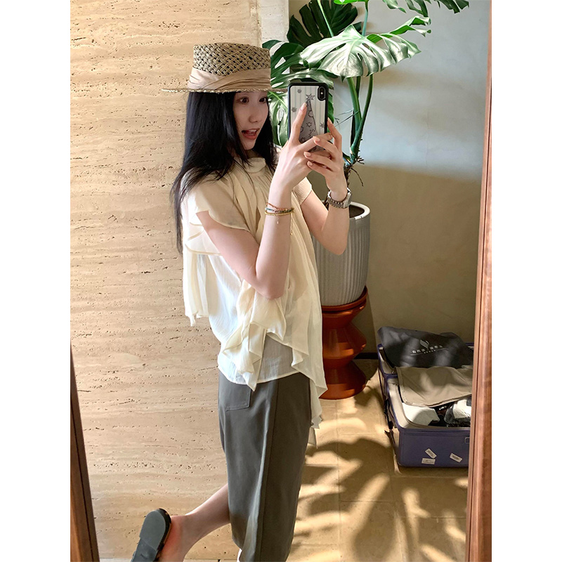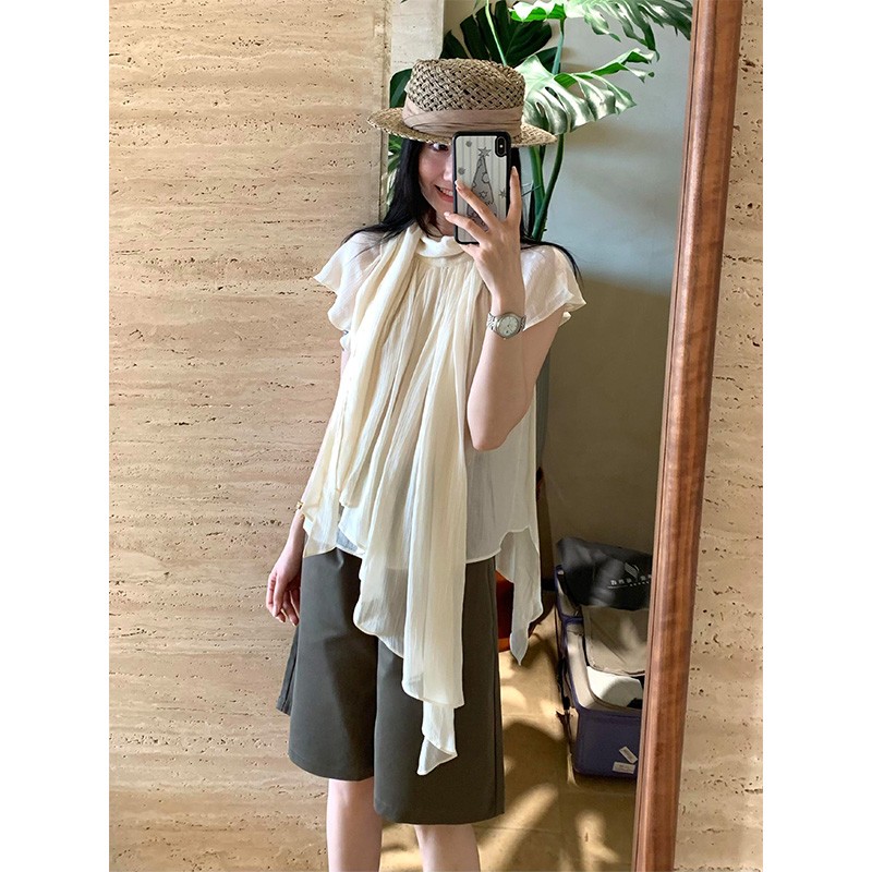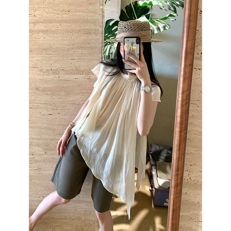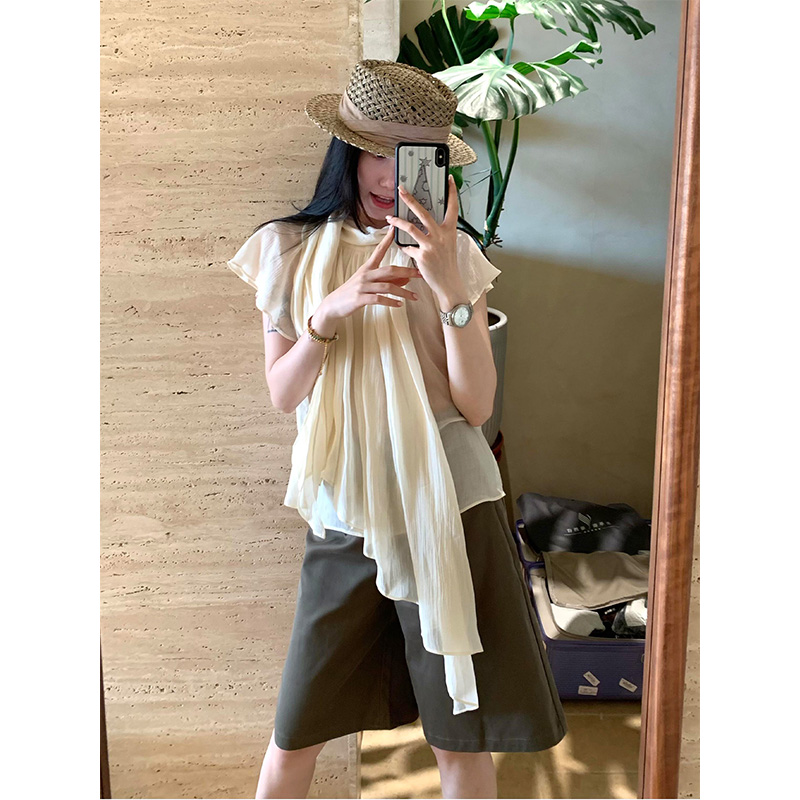 정가 재고 있음 한 부서 캐주얼 바람이 아닙니다. 규칙 리본 반팔 셔츠 하이웨이스트 슬림해 보이는 넓은 다리가 짧다. 바지 세트