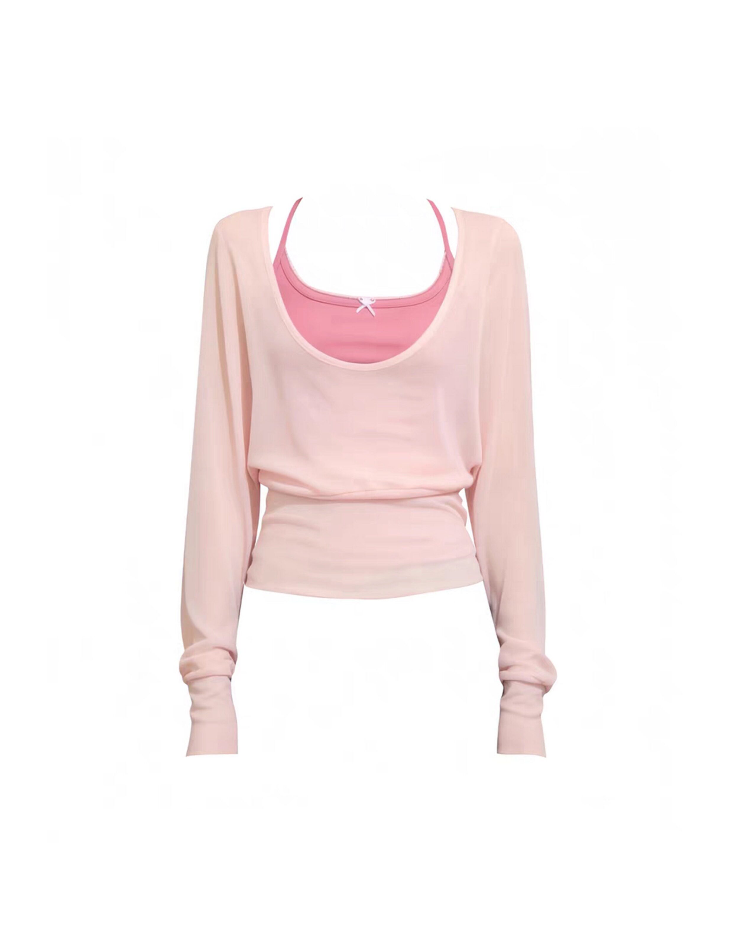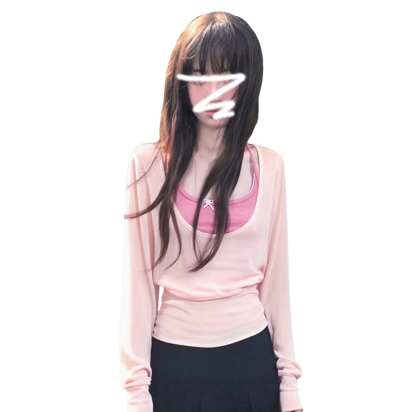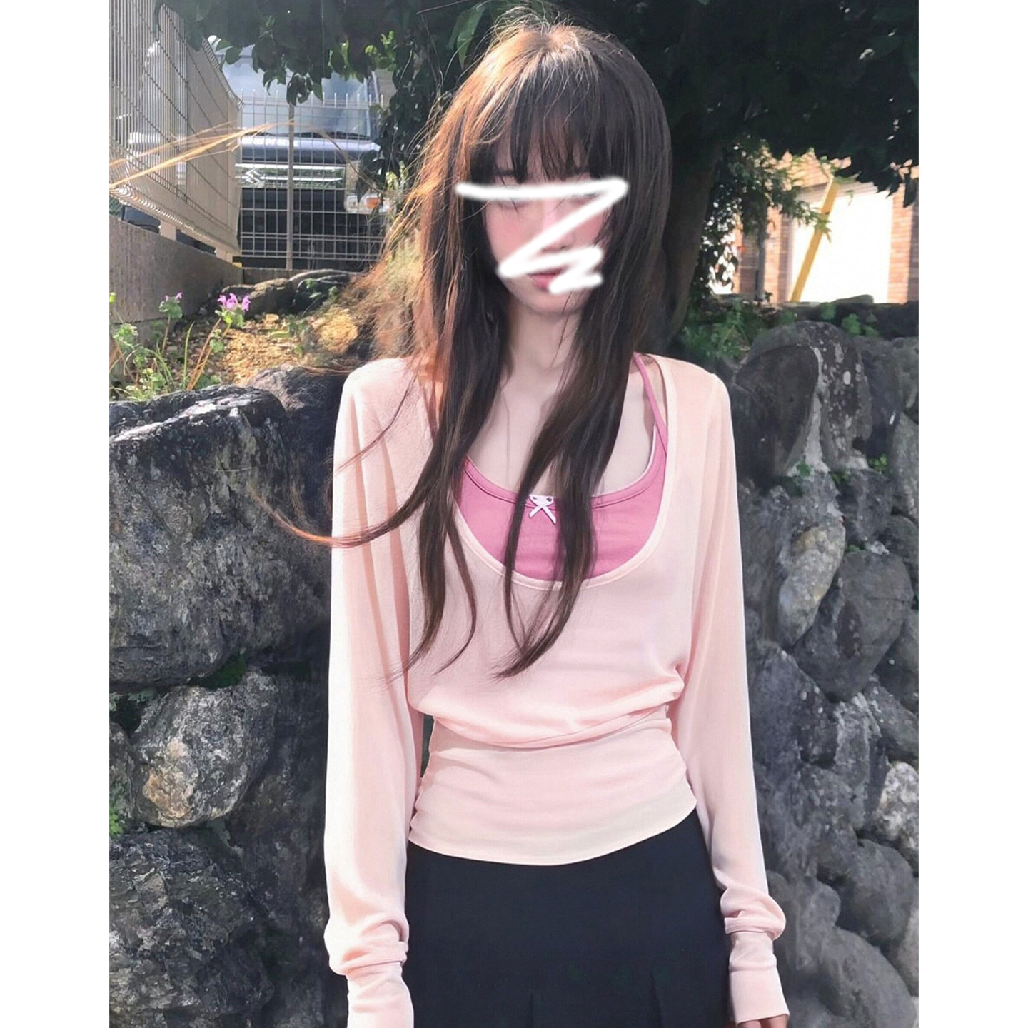 핑크색 Tulle 자외선 차단 블라우스 여성 여름 얇은 스타일 마이크로 ~을 통해 몸매 가꾸기 허리 수축 핫걸 긴팔 티셔츠 디자인 센스 맨위