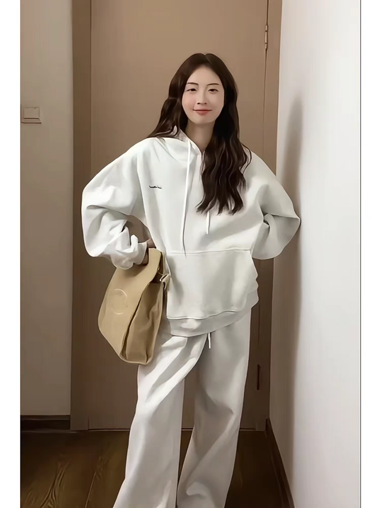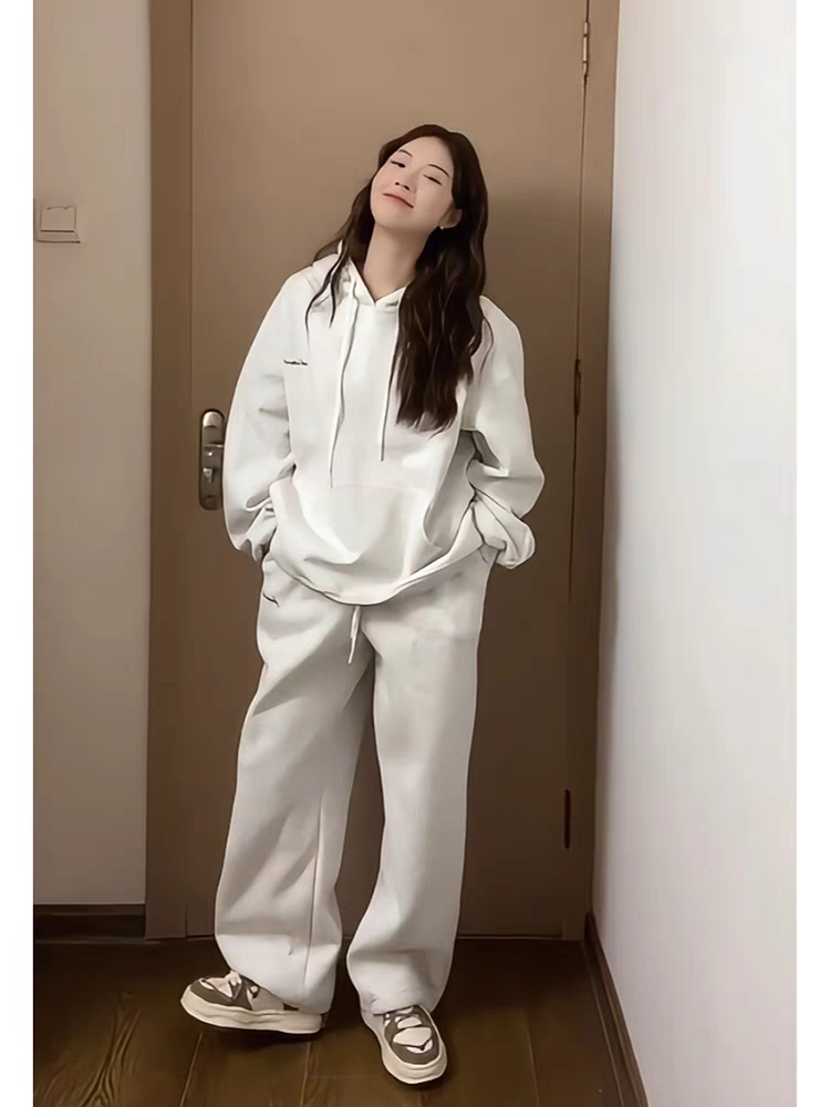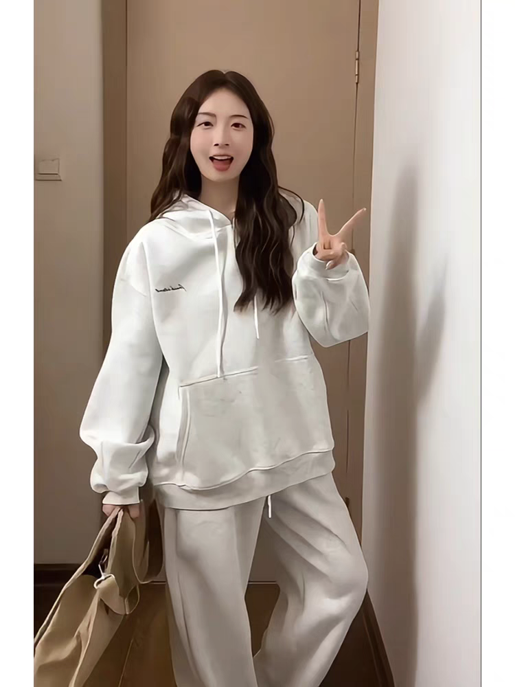 얇은 스타일 털이 있는 후드 티 스웨터 세트 여성 봄과 가을 학생 한국 스타일 루즈핏 긴팔 긴 바지 투피스 세트