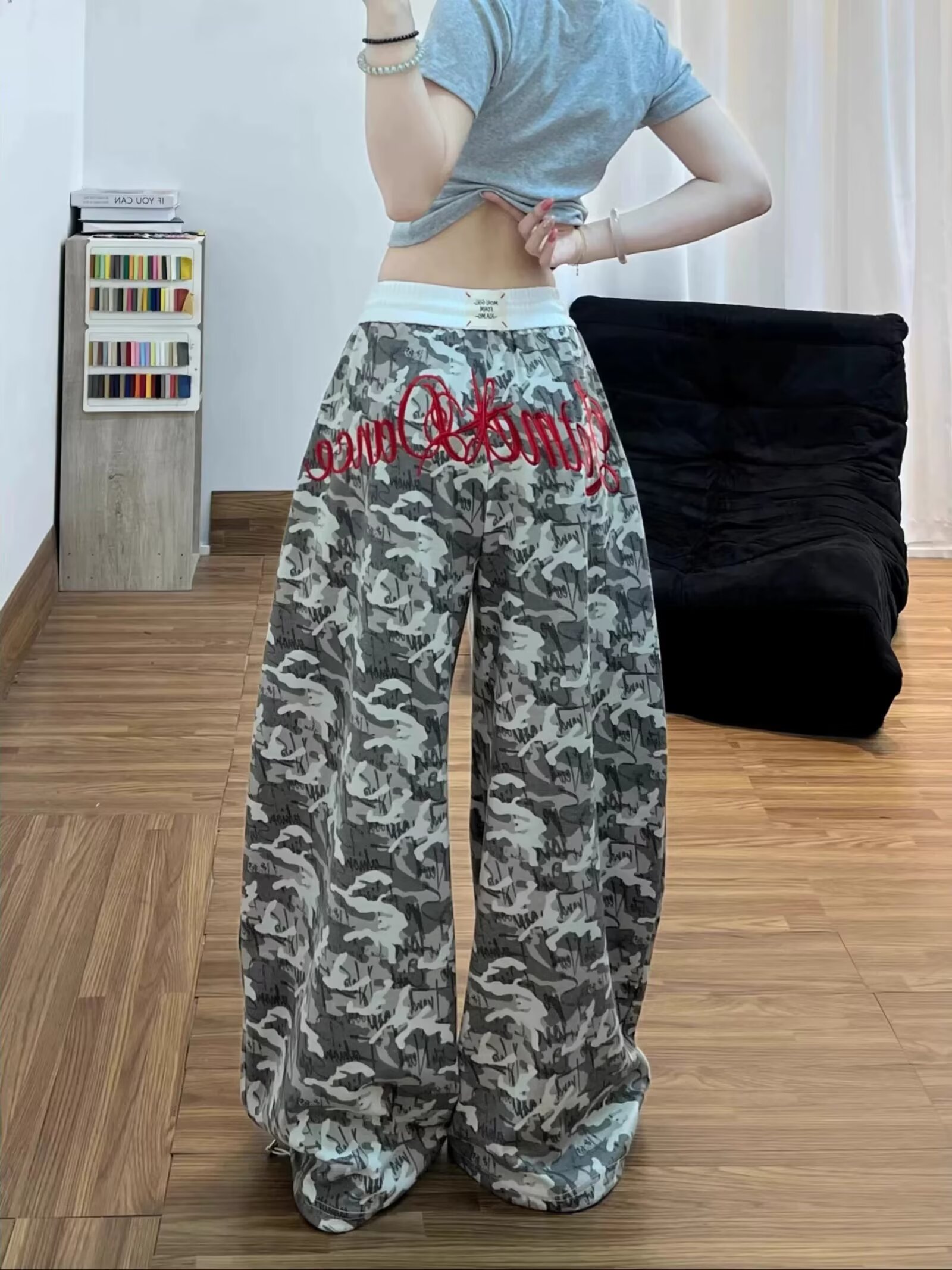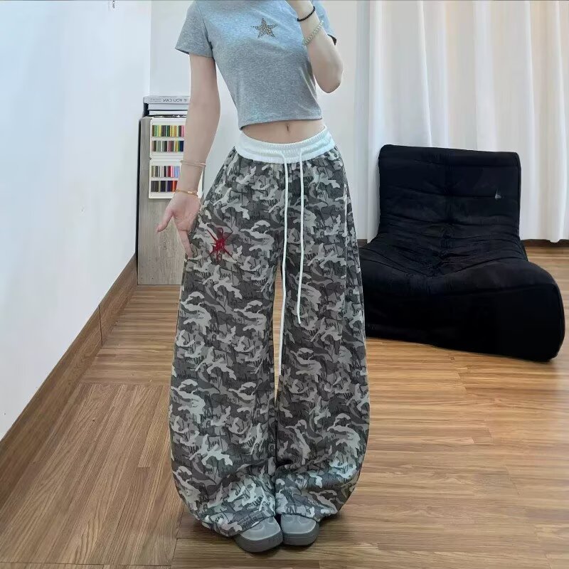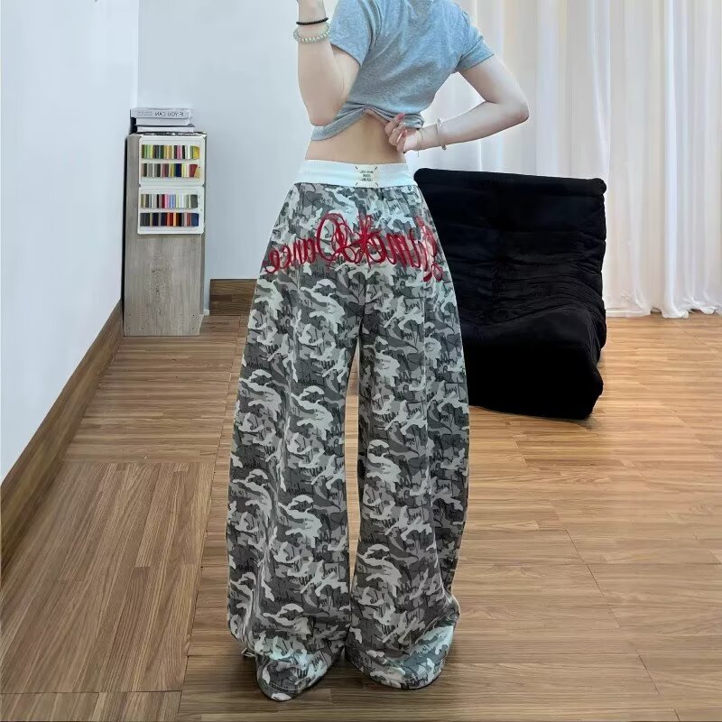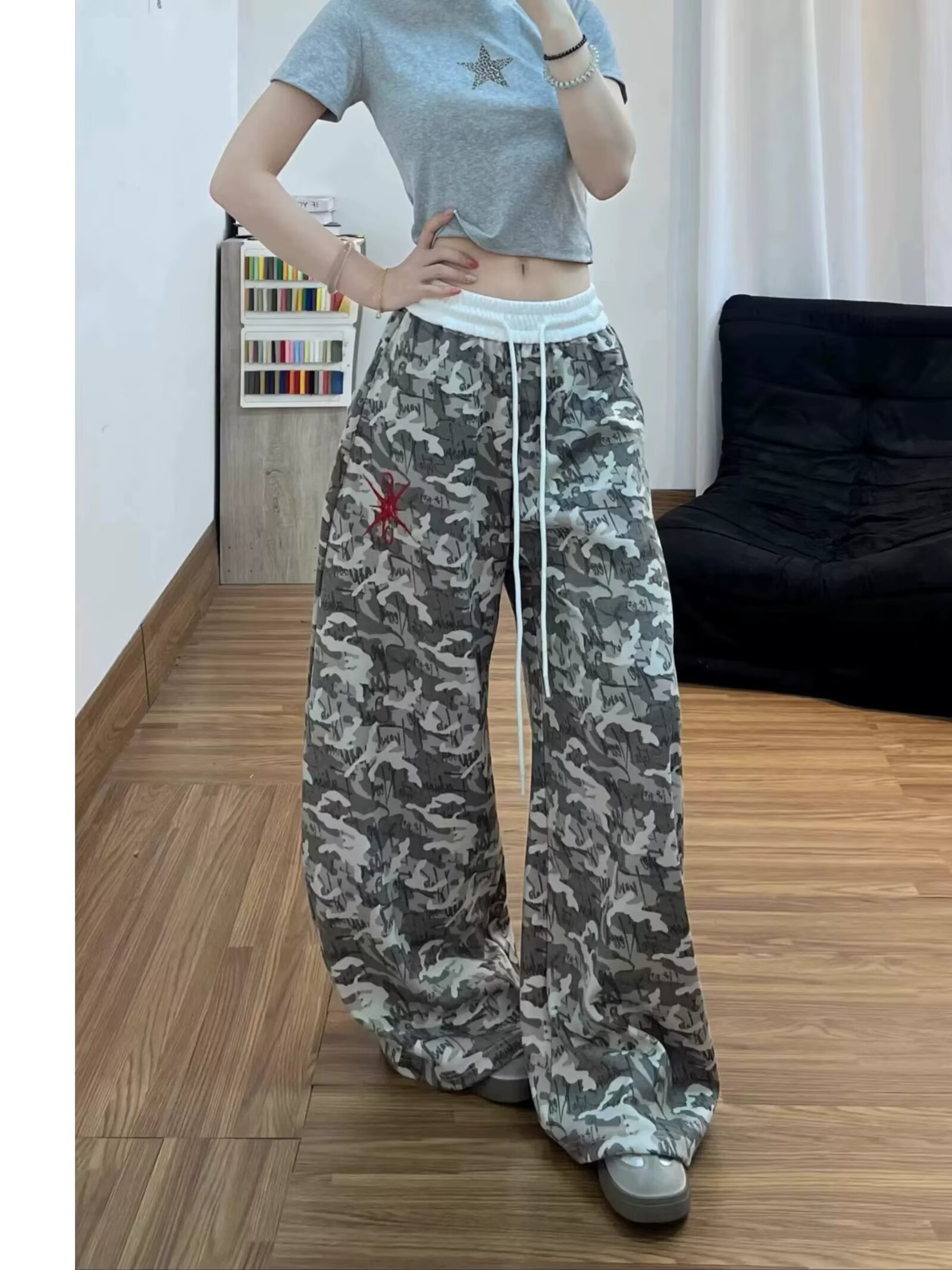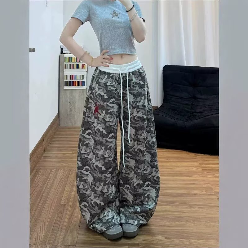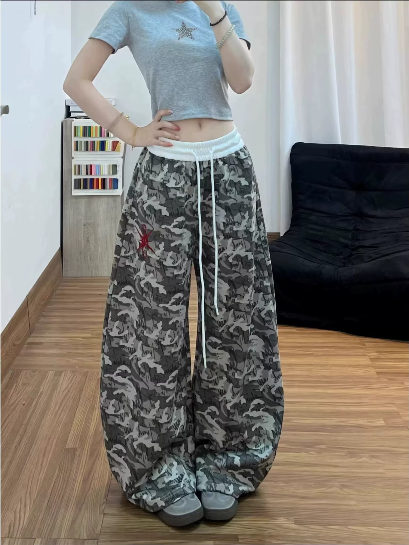 아메리칸 레트로 숫자 알파벳 오각형 별 프린트 더블 허리 머리 캐주얼 바지 여성 루즈핏 스트리트 댄스 넓은 다리 길이 바지 트렌디