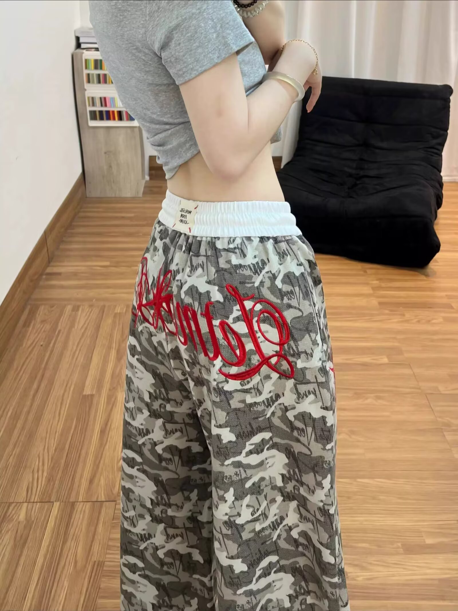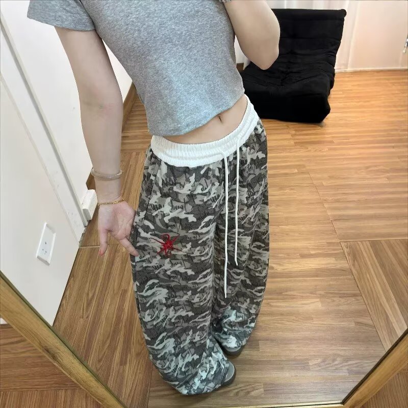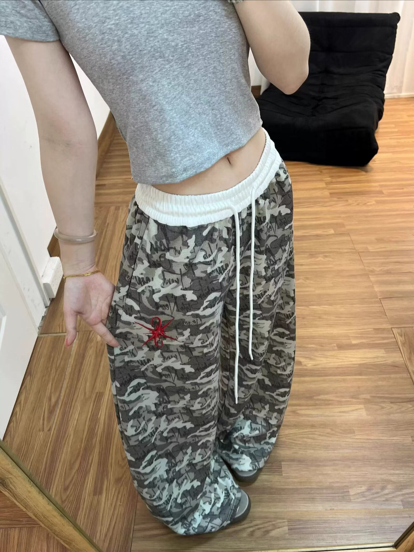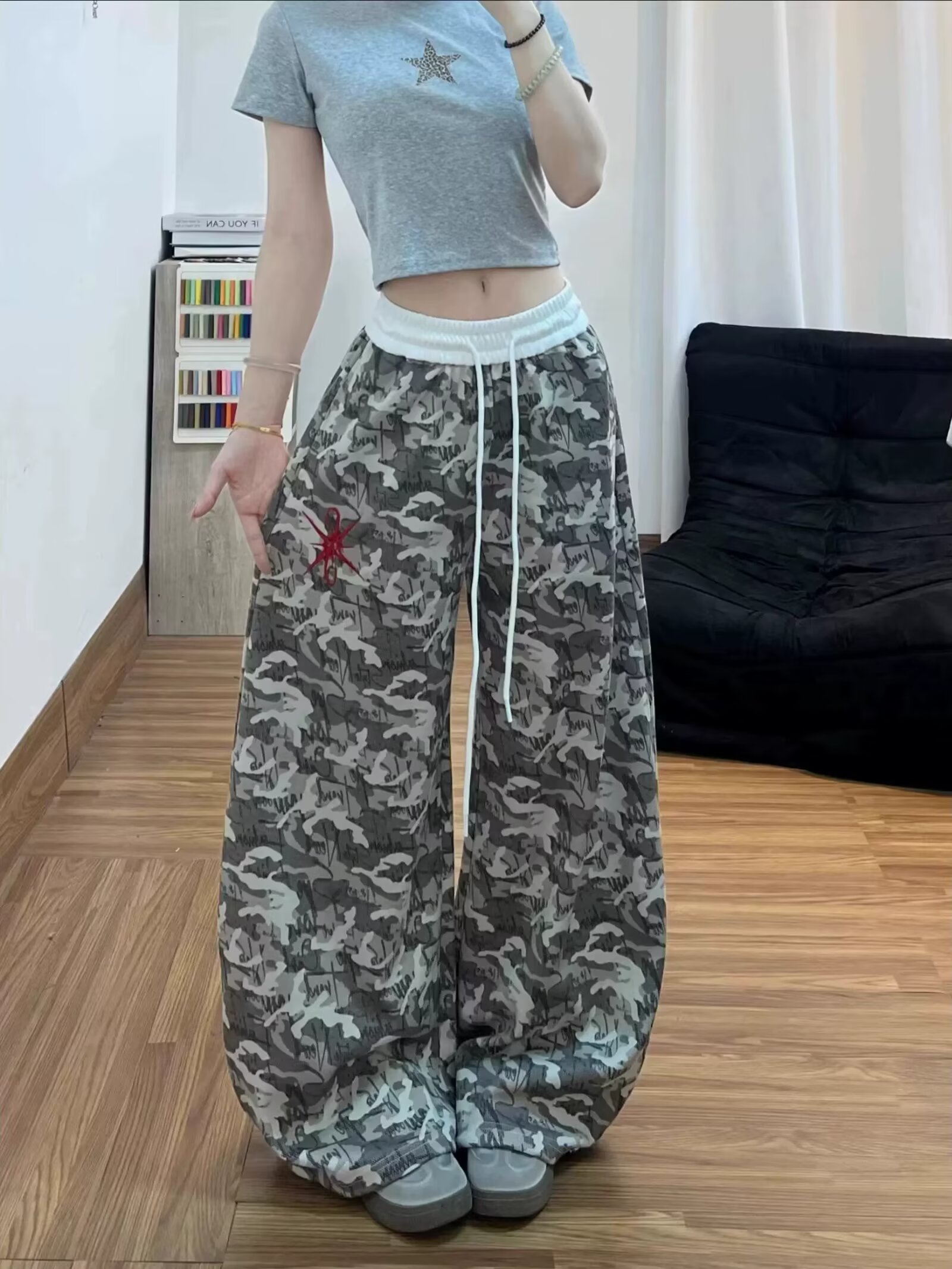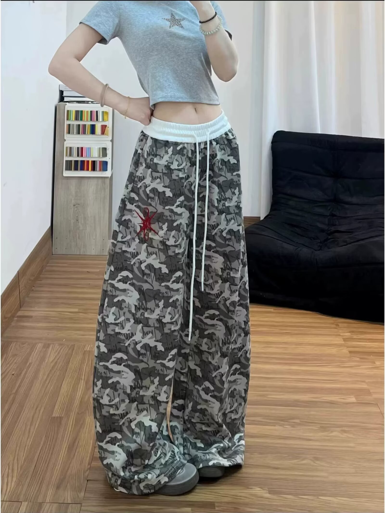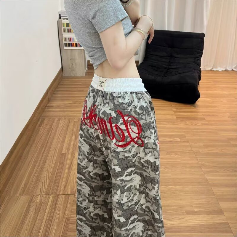 아메리칸 레트로 숫자 알파벳 오각형 별 프린트 더블 허리 머리 캐주얼 바지 여성 루즈핏 스트리트 댄스 넓은 다리 길이 바지 트렌디