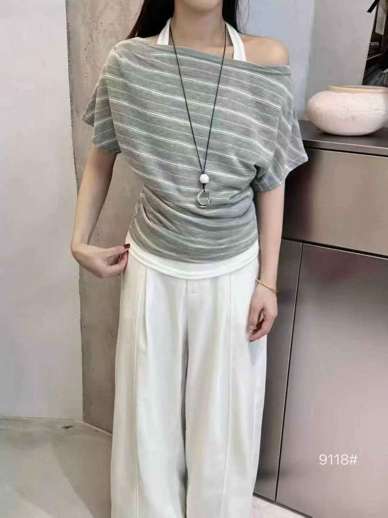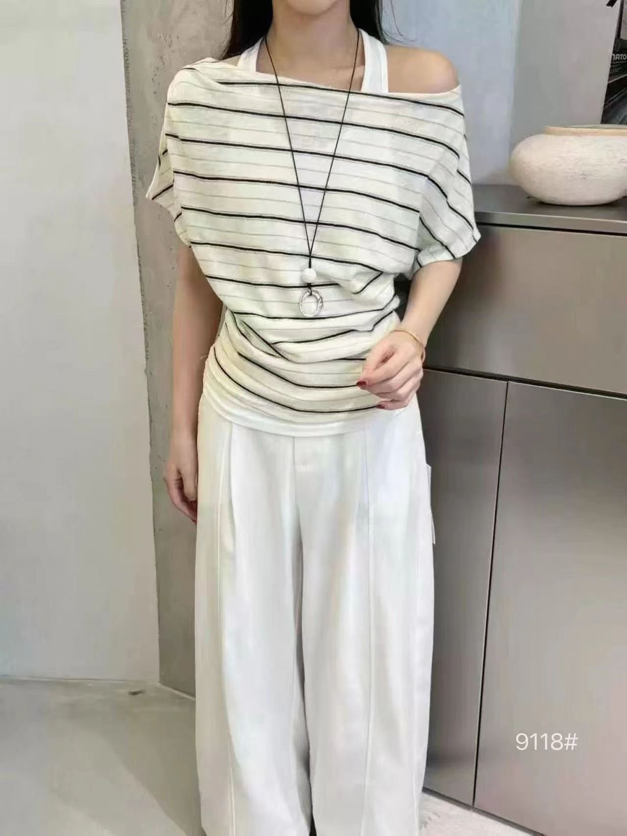 2026 여름 새로운 한국 스타일 패션 다용도 슬림해 보이는 스트라이프 비스듬한 어깨 반팔 티셔츠 여성 셔츠 여성