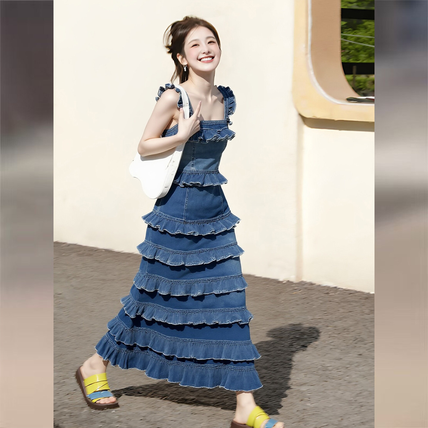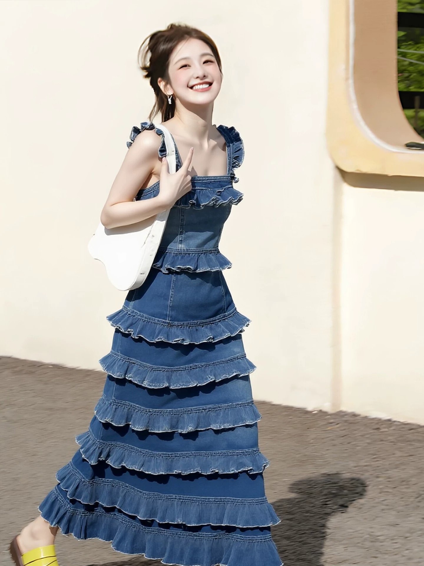 올해 봄 새로운 프랑스식 낭만주의 바람 파란색 데님 프릴 슬립 케이크 롱 스커트 여성 품격 슬림해 보이는
