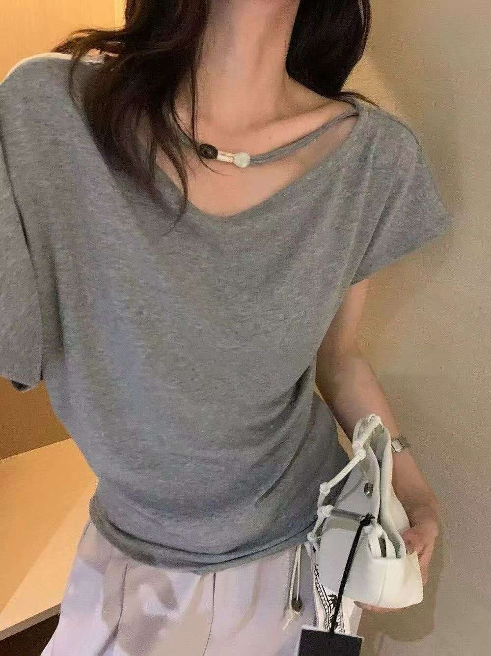 한 부서 초여름 착용 가져 가라. 고유 한 스트랩 비스듬한 어깨 의류 여성 2026 여름 새로운 반팔 티셔츠 디자인 센스 작은 대중