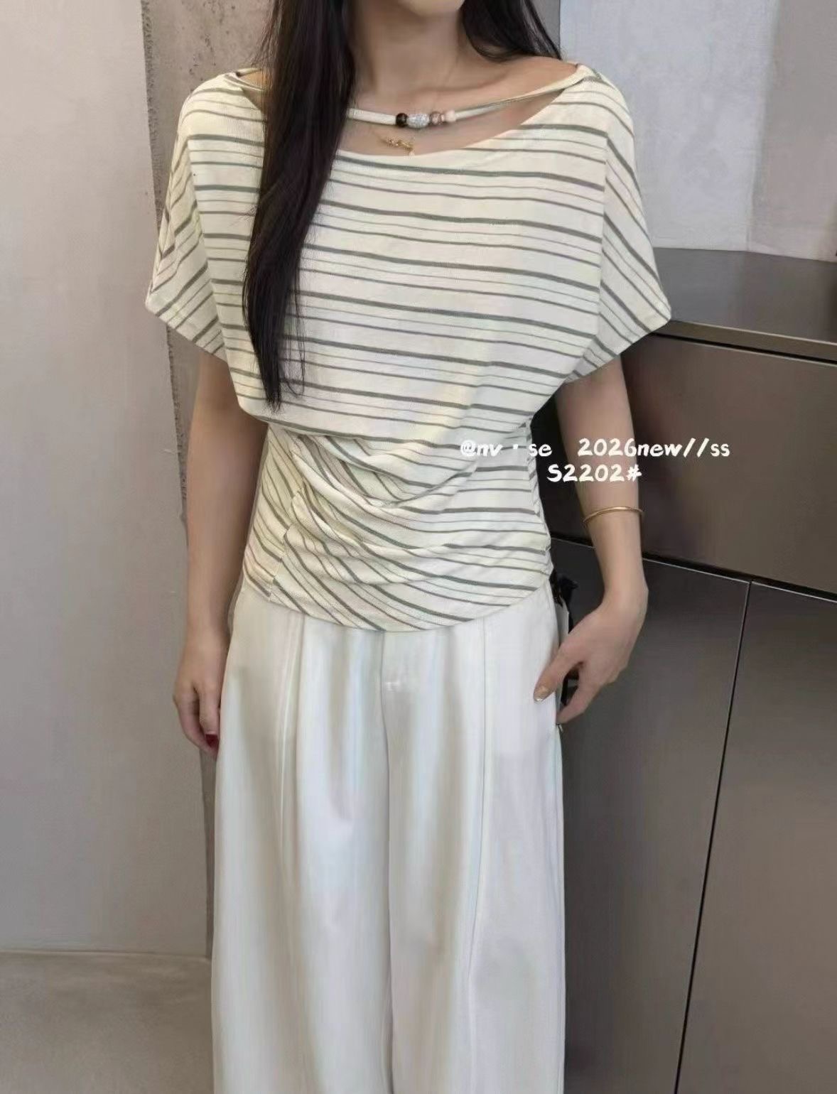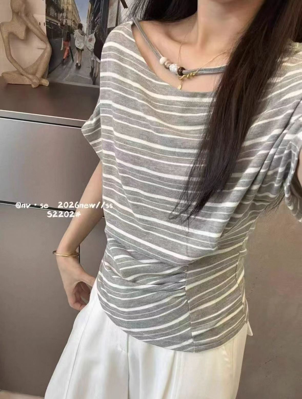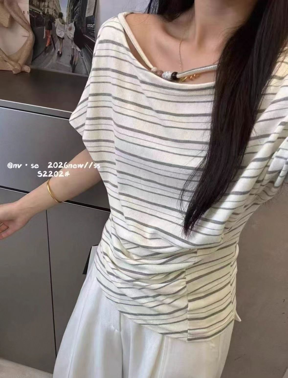 2026 여름 새로운 한국 스타일 패션 다용도 슬림해 보이는 스트라이프 비스듬한 어깨 반팔 티셔츠 여성 셔츠 여성