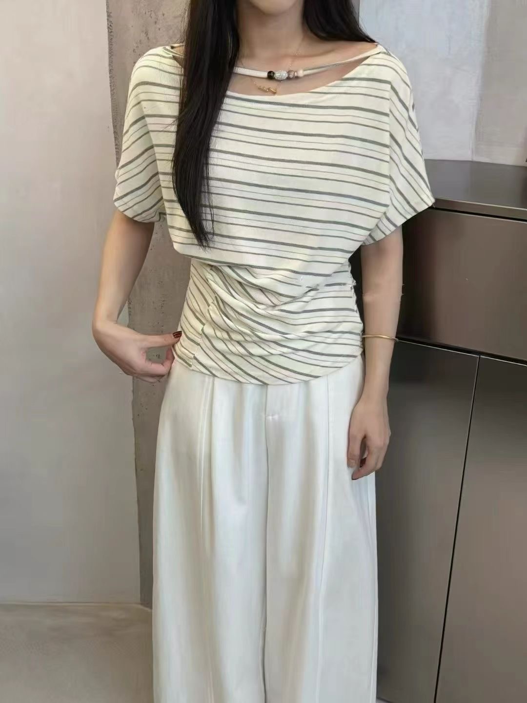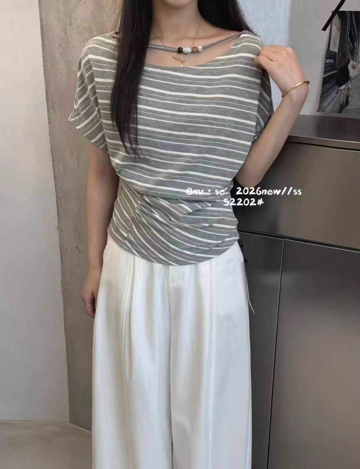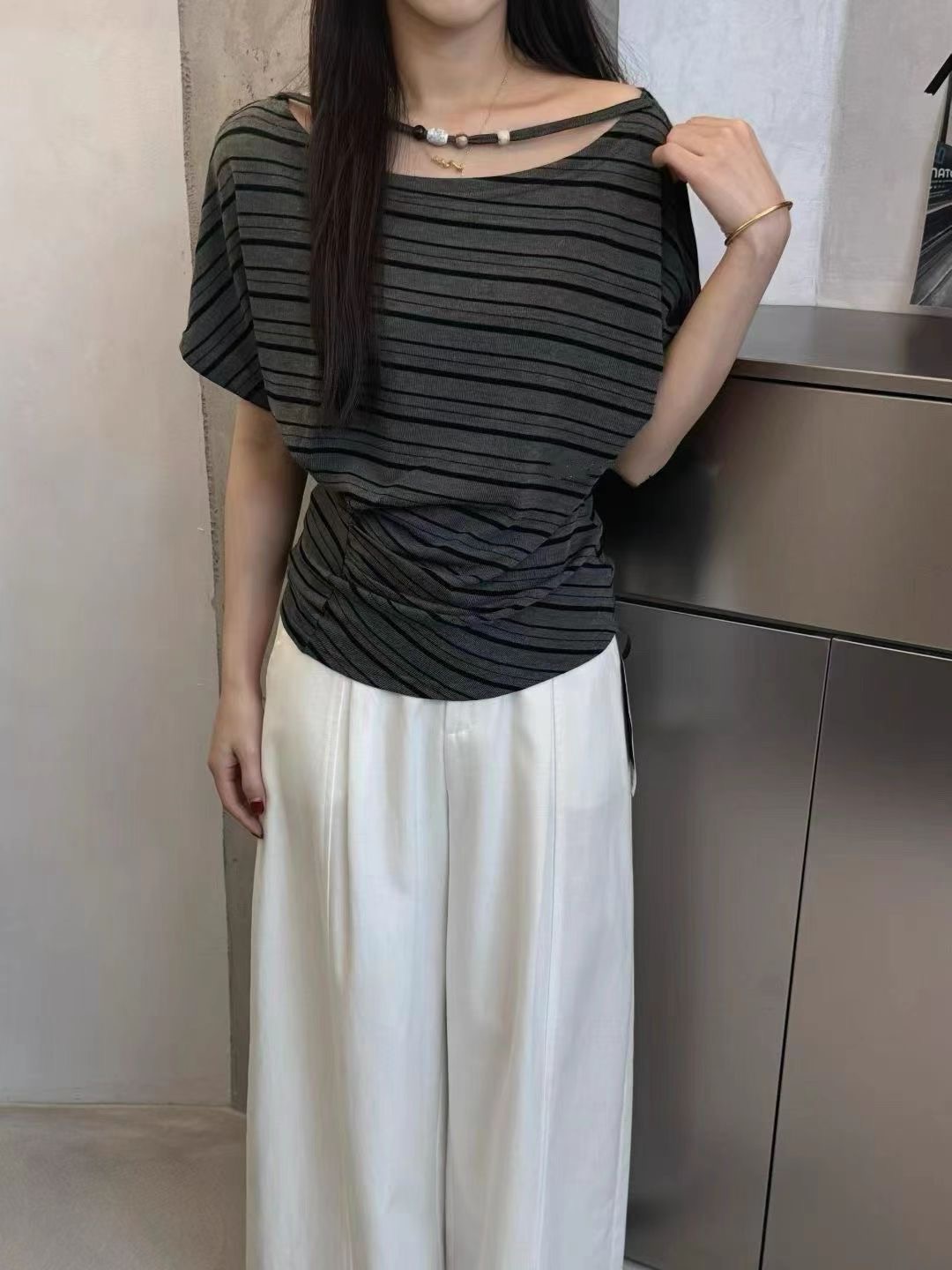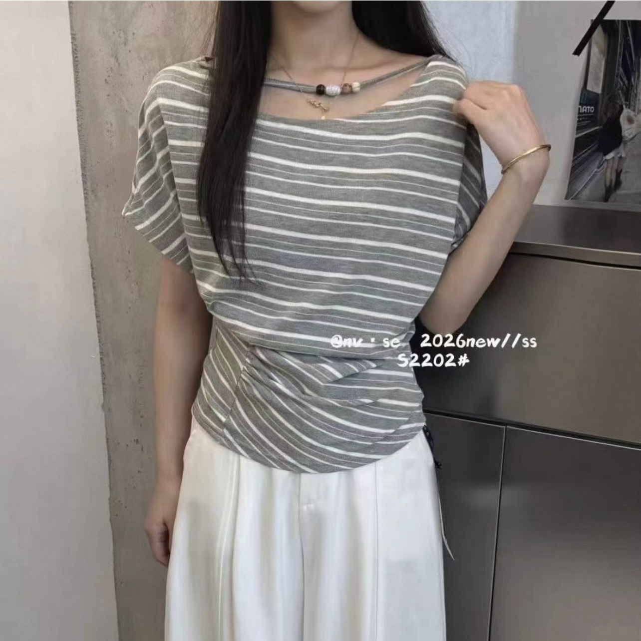 2026 여름 새로운 한국 스타일 패션 다용도 슬림해 보이는 스트라이프 비스듬한 어깨 반팔 티셔츠 여성 셔츠 여성