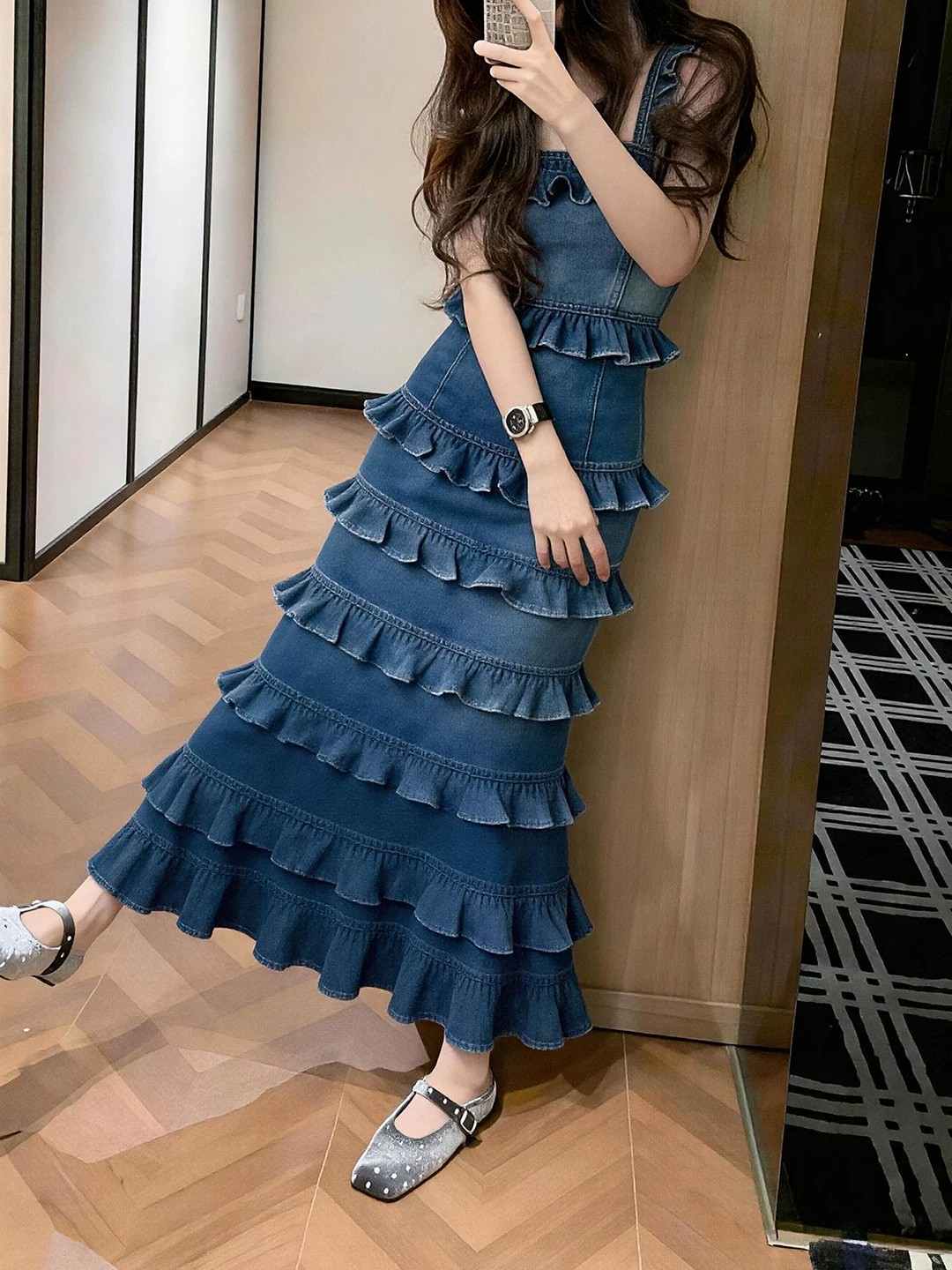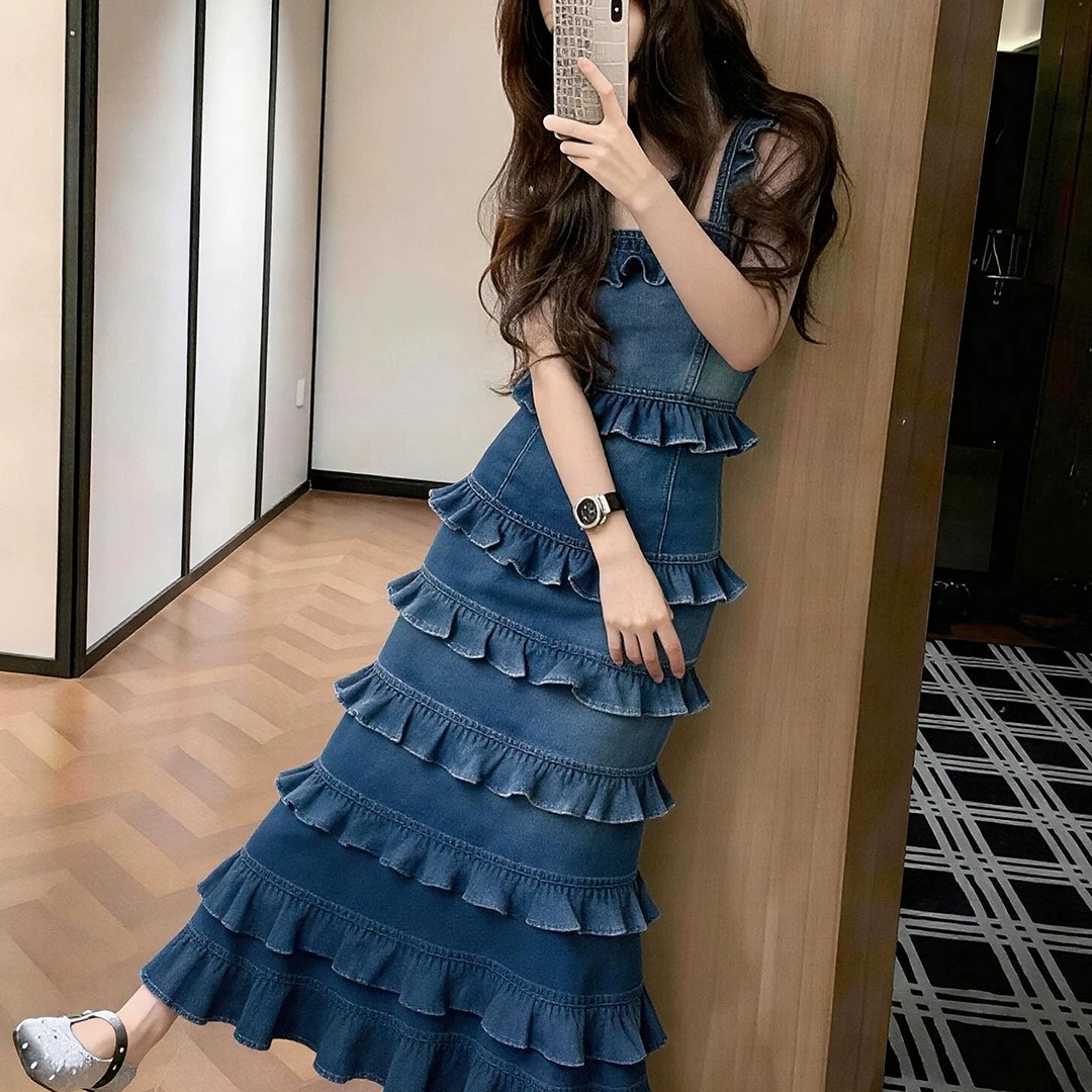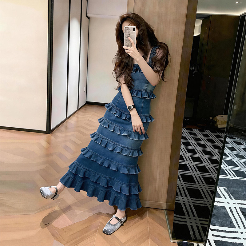올해 봄 새로운 프랑스식 낭만주의 바람 파란색 데님 프릴 슬립 케이크 롱 스커트 여성 품격 슬림해 보이는