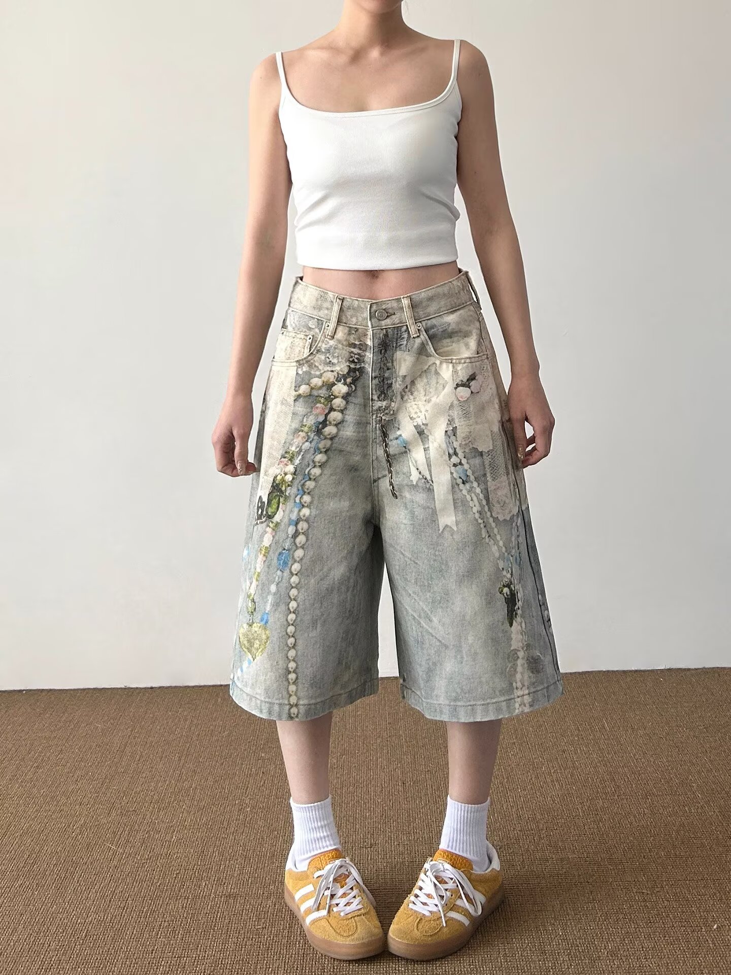 레트로 자수 찢어진 부분 5 점 청바지 여성 여름 새로운 외국 가스 하이웨이스트 다용도 루즈핏 캐주얼 넓은 다리 바지