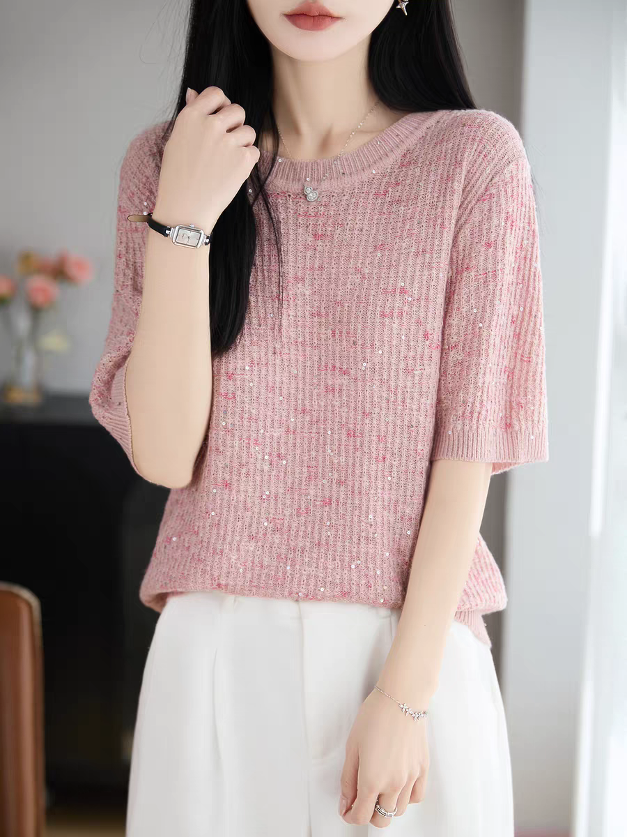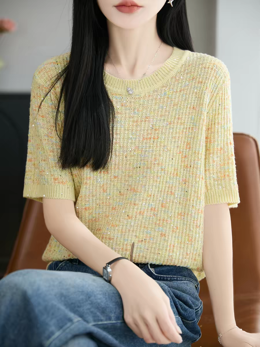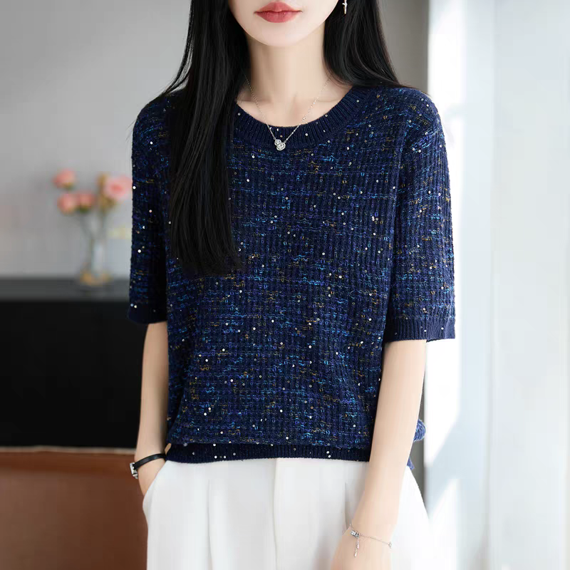 카모플라주 라이 경기 서울 주간 실크 스팽글 니트 반팔 티셔츠 여성 2026 여름 루즈핏 슬림해 보이는 통기성 맨위 얇은