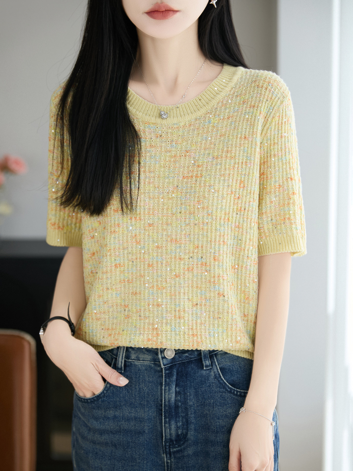 2026 봄 새로운 한 부서 루즈핏 슬림해 보이는 라운드 넥 자카드 라이 경기 서울 주간 실크 니트 반팔 여성 다용도 맨위