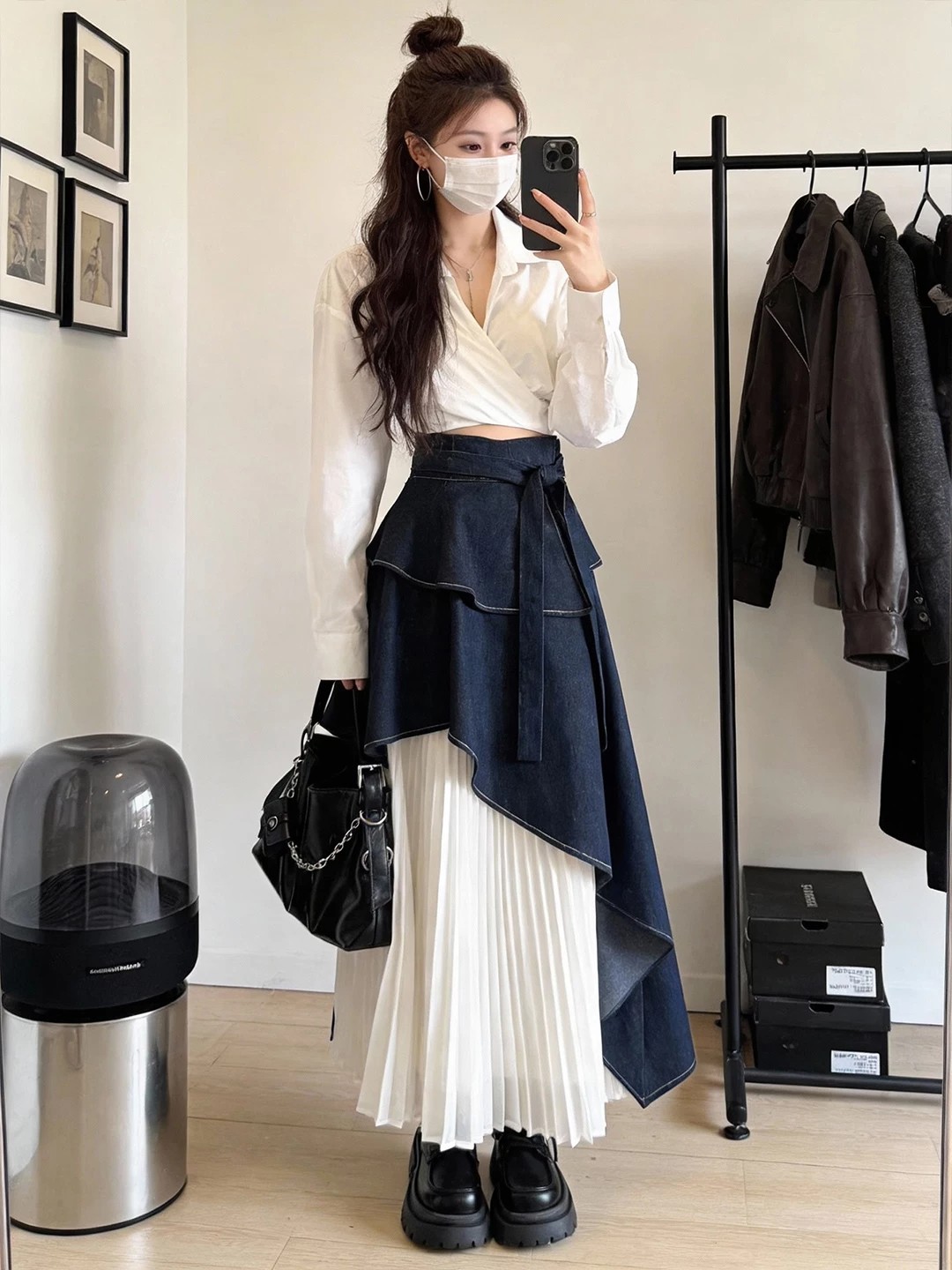한국 스타일 디자인 센스 불규칙 주름 패치워크 한 마디 반신 롱 스커트 여성 봄 가을 롱 코트 하이웨이스트 작은 키 치마