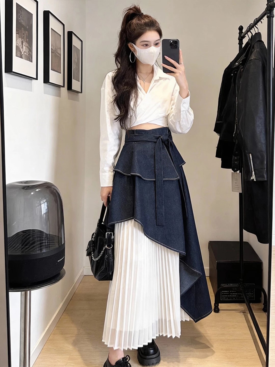 올해 여름 빅 사이즈 디자인 센스 데님 패치워크 불규칙 반신 롱 스커트 여성 레이스업 디자인 센스 출퇴근 치마