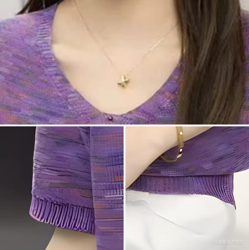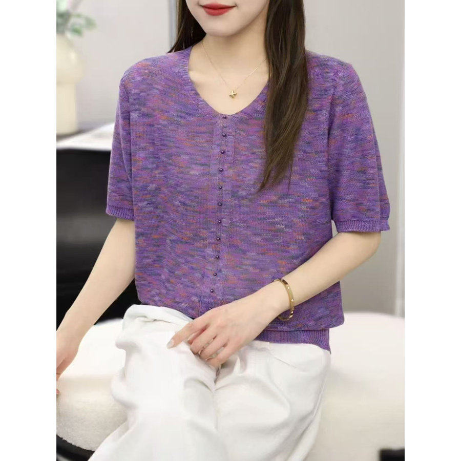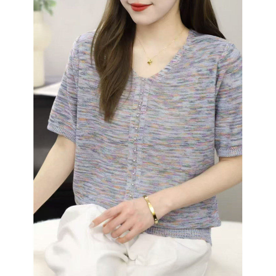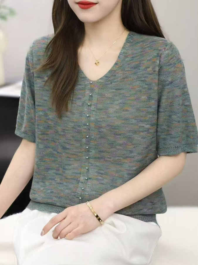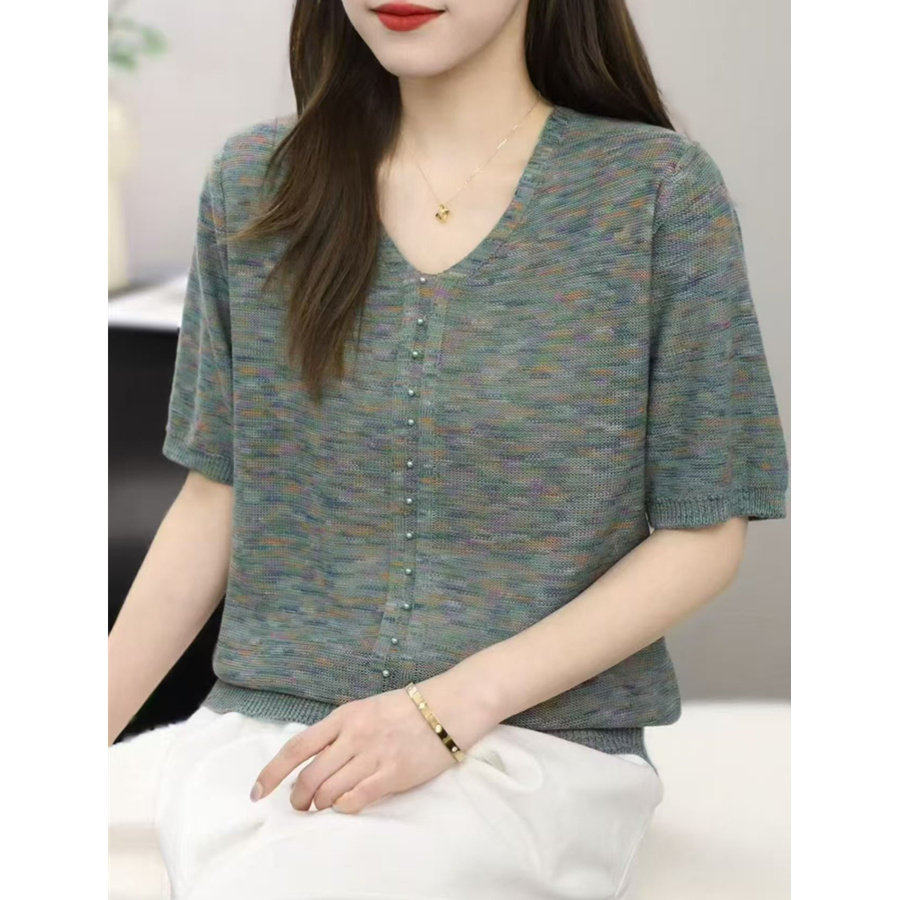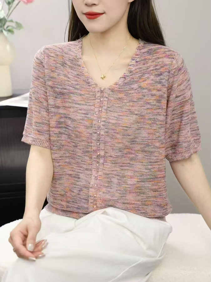 V넥 반팔 니트 스웨터 여성 배색 얇은 스타일 루즈핏 슬림해 보이는 다용도 니트 맨위 다용도 연령 감소 얼음 실크 셔츠 티셔츠