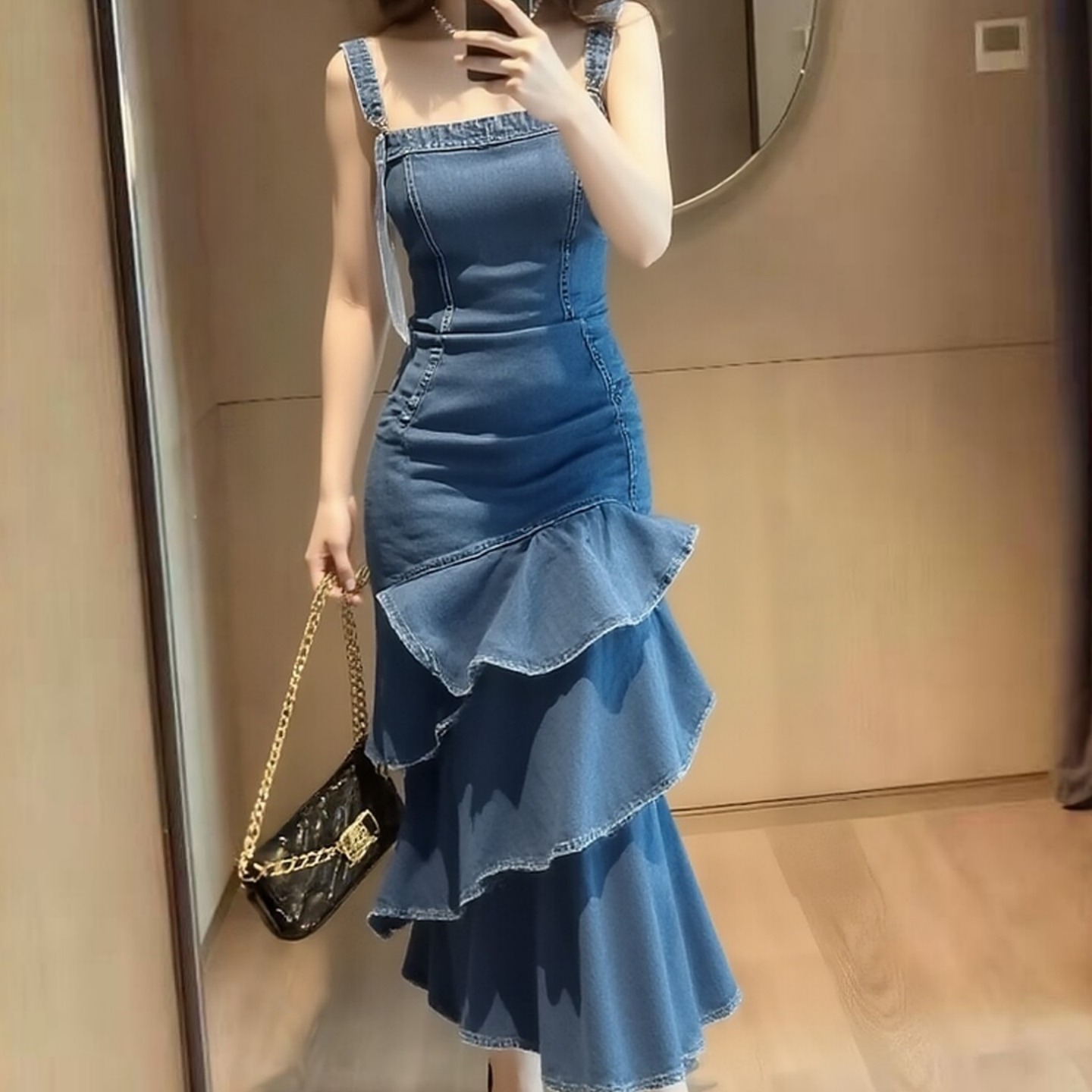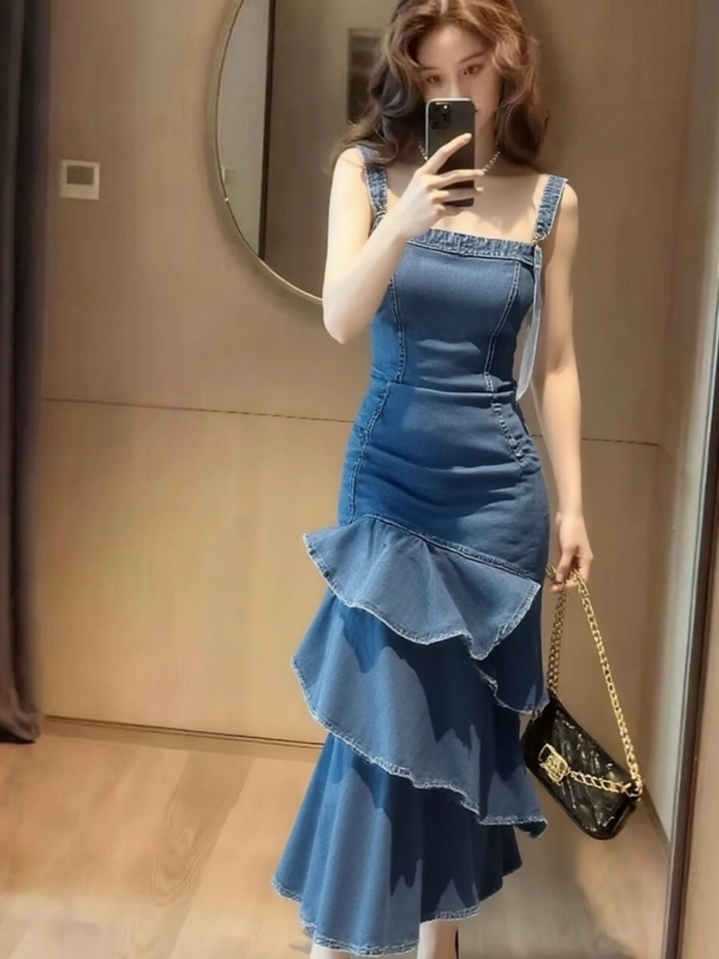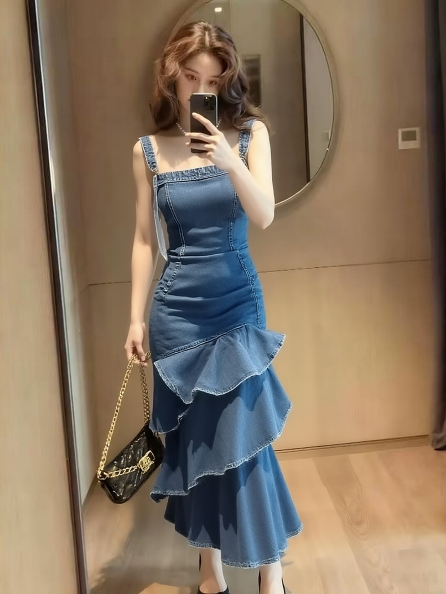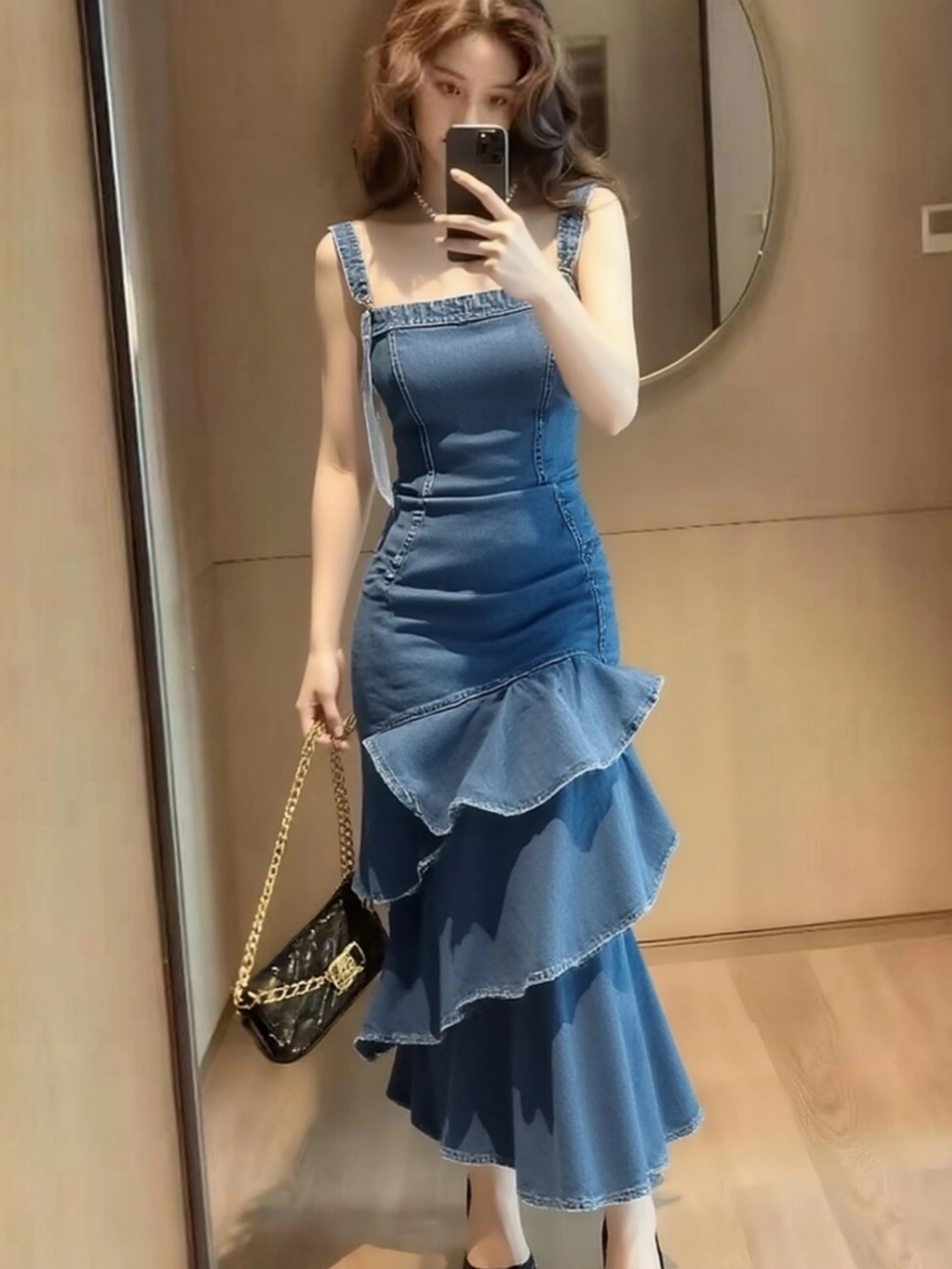 올해 봄 새로운 프랑스식 낭만주의 바람 파란색 데님 프릴 슬립 케이크 롱 스커트 여성 품격 슬림해 보이는