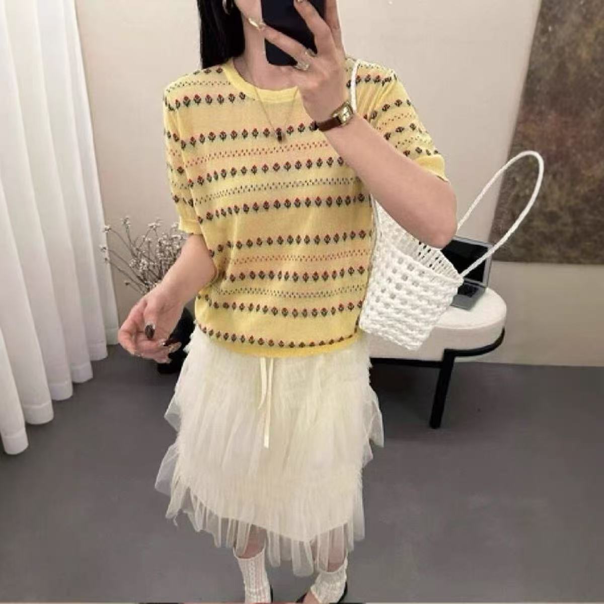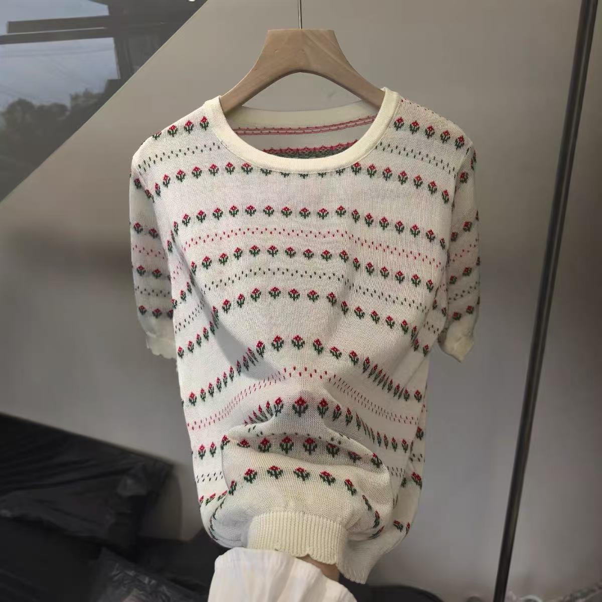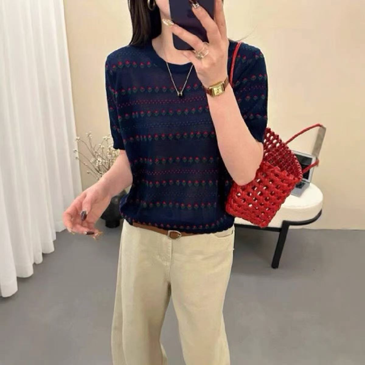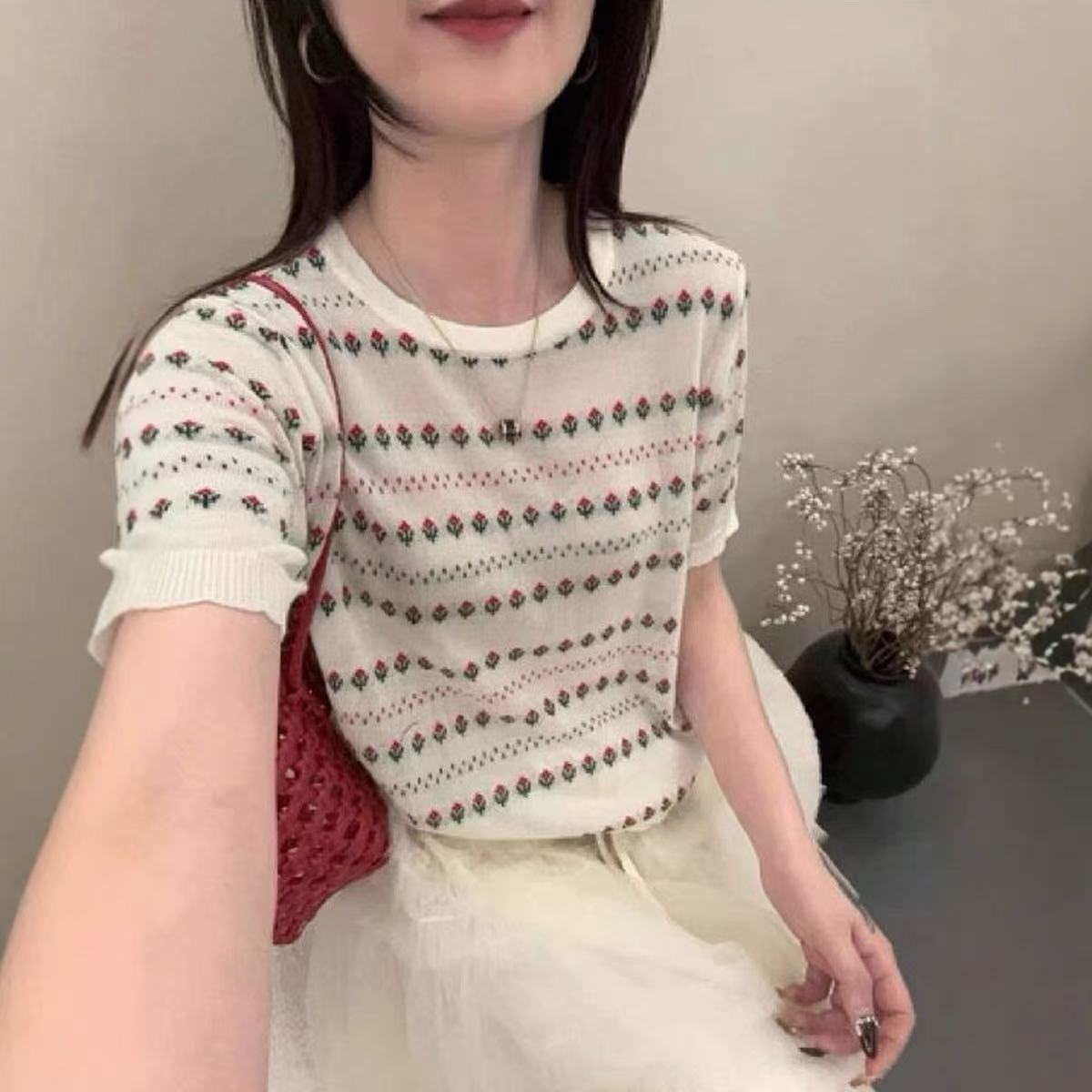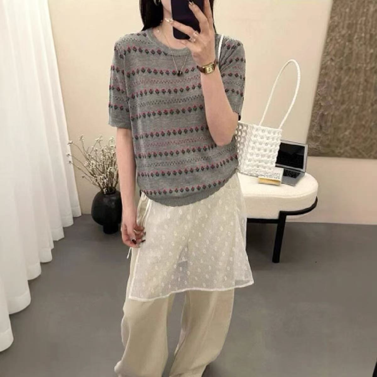 2026 봄 새로운 한 부서 루즈핏 슬림해 보이는 라운드 넥 자카드 라이 경기 서울 주간 실크 니트 반팔 여성 다용도 맨위