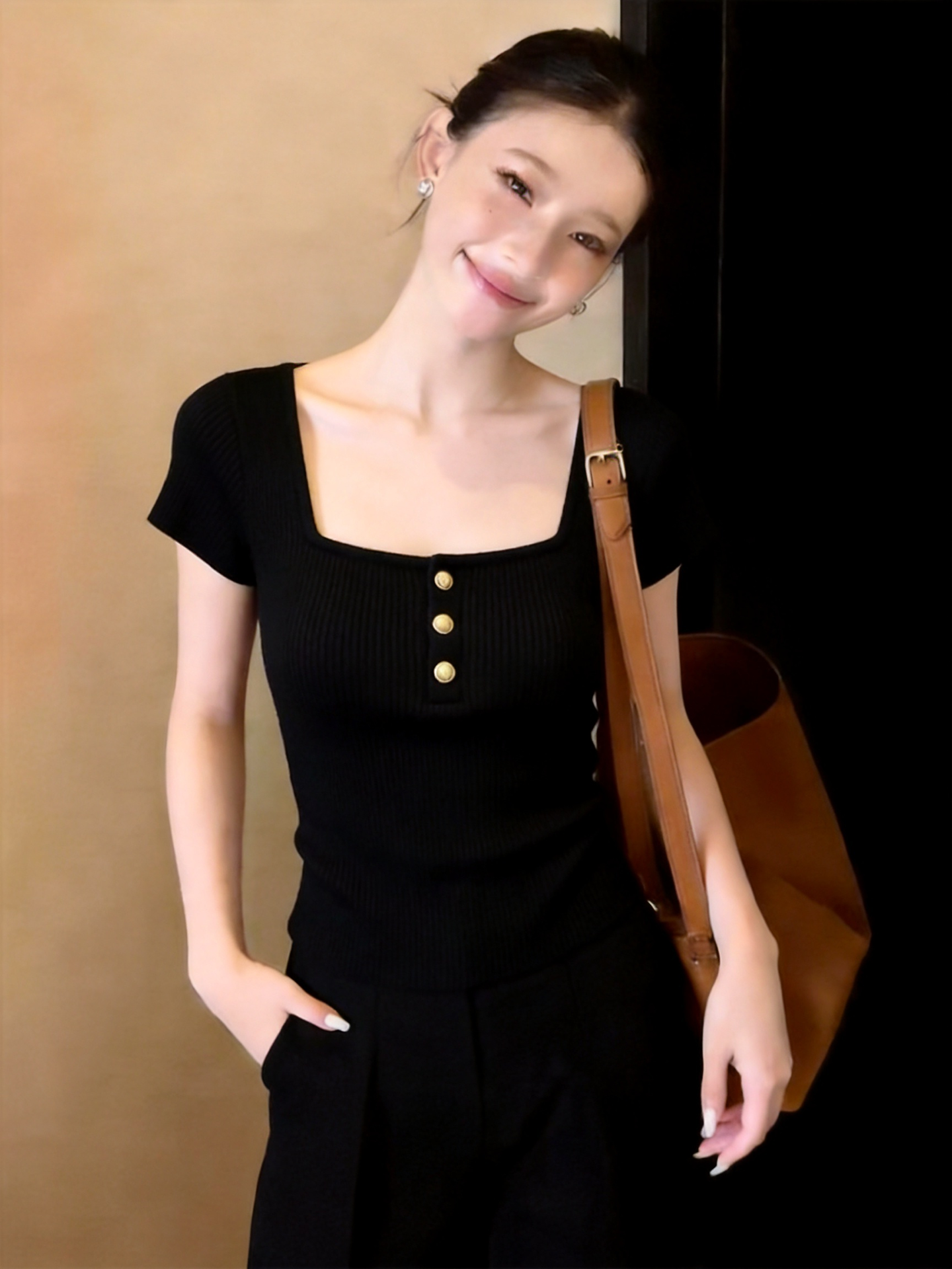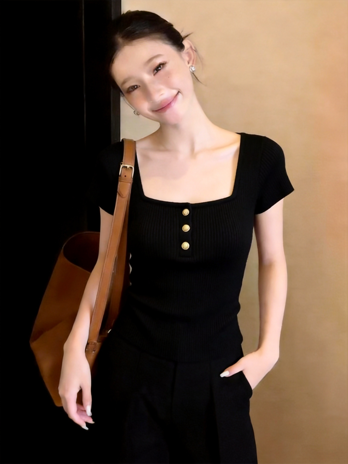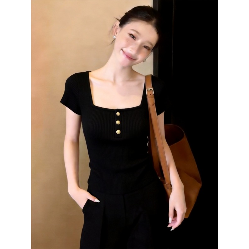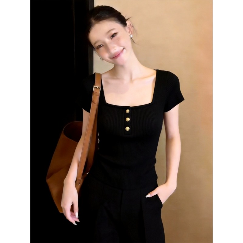 빛 럭셔리 바람 광장 칼라 반팔 니트 스웨터 여성 비철금속 버클 몸매 가꾸기 양모 스웨터 2026 봄 여름 품격 맨위