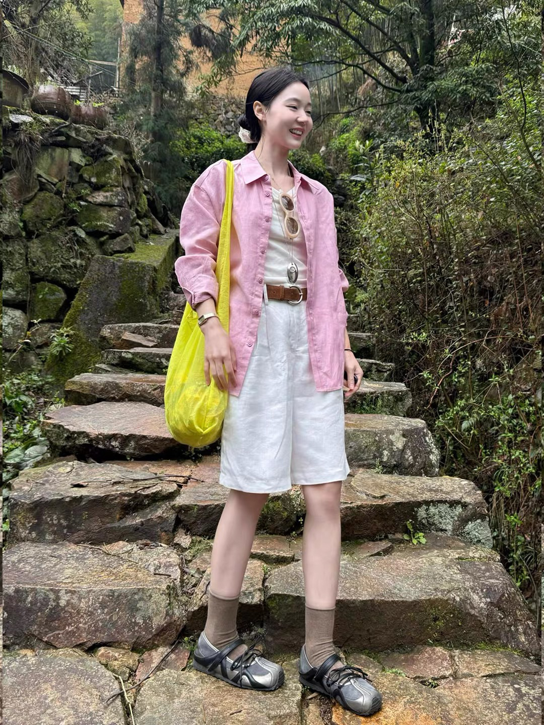 캐주얼 느긋한 바람 핑크색 셔츠 세트 여성 여름 루즈핏 슬림해 보이는 느슨함 센스 품격 투피스 세트
