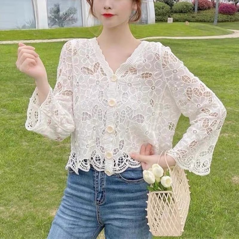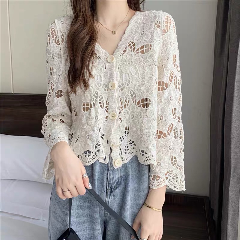 한국 스타일 자수 홀로우 아웃 자수 레이스 오픈 가디건 여성 봄 여름 새로운 고유 한 Chic 아름다운 자이언트 잘 생긴 작은 맨위