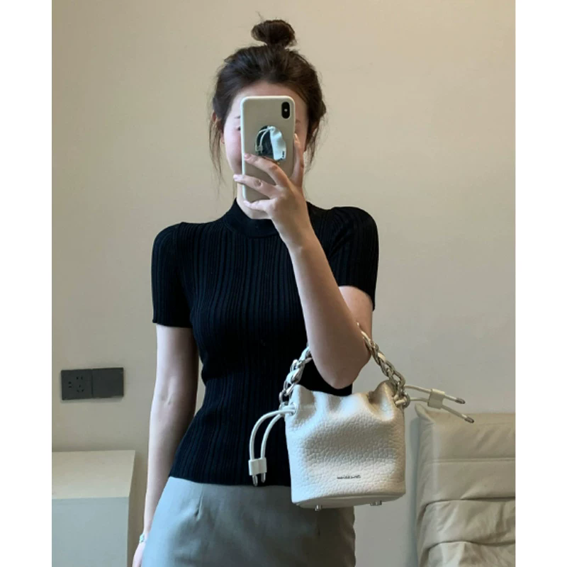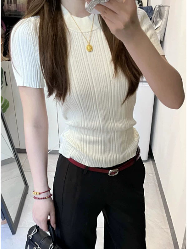 u+mini 미니멀리즘 고급 센스 라이 경기 서울 프로 피부 통기성 높은 탄력성 몸매 가꾸기 슬림해 보이는 반팔 니트 작은 셔츠 맨위