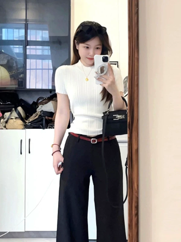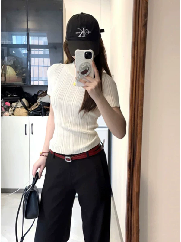 화이트 라운드 넥 긍정적 인 어깨 니트 반팔 티셔츠 여성 고유 한 아름다운 꼬집기 허리 오래된 돈 바람 착용 가져 가라. 수리