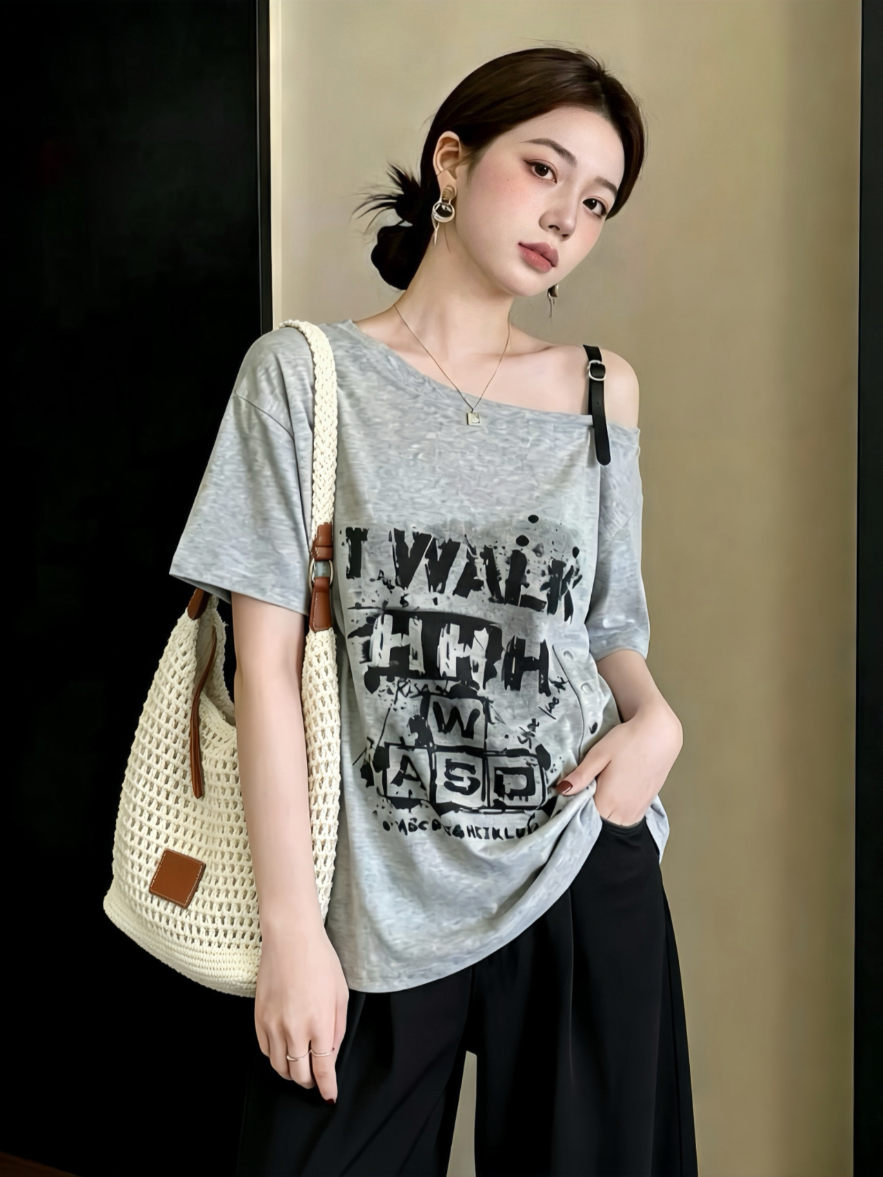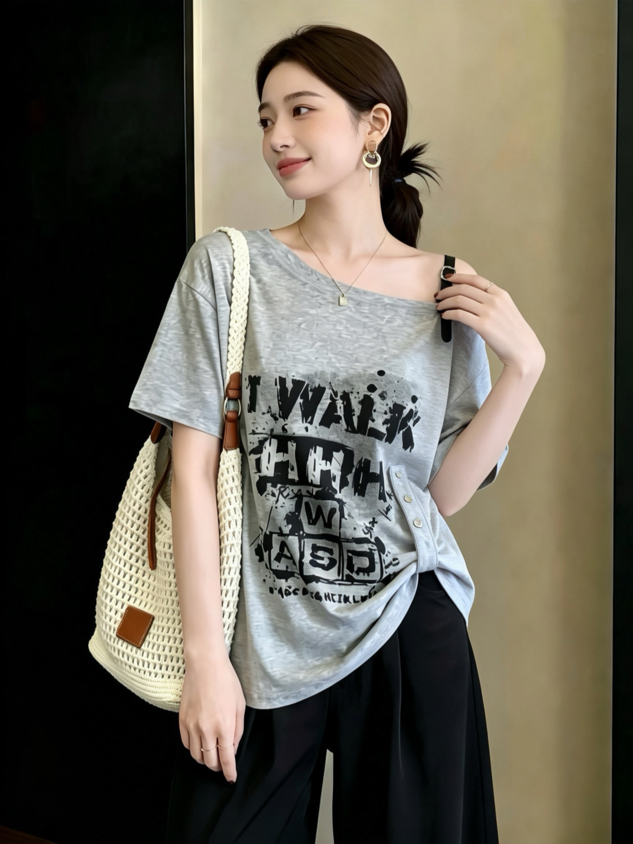 실사 빅 사이즈 여성 의류 새로운 비스듬한 어깨 루즈핏 슬림해 보이는 패션 루즈핏 다용도 프린트 반팔 티셔츠