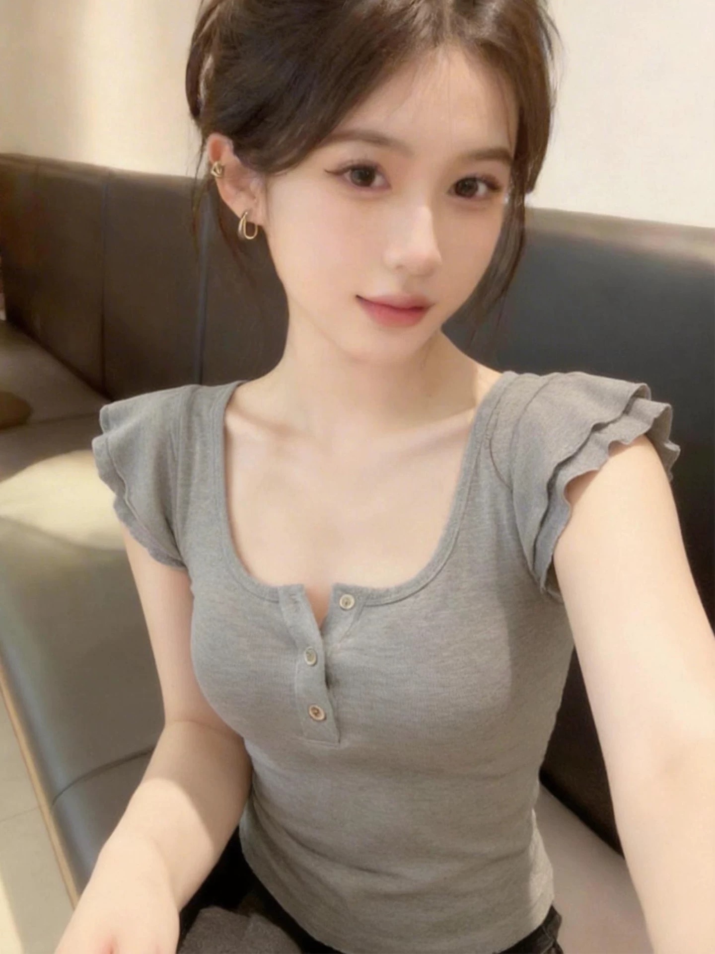 순수한 욕망 회색 u 칼라 작은 날다 소매 반팔 티셔츠 여성 2026 여름 새로운 자이언트 잘 생긴 ~ 중 몸매 가꾸기 맨위 아니요 명중 섹션