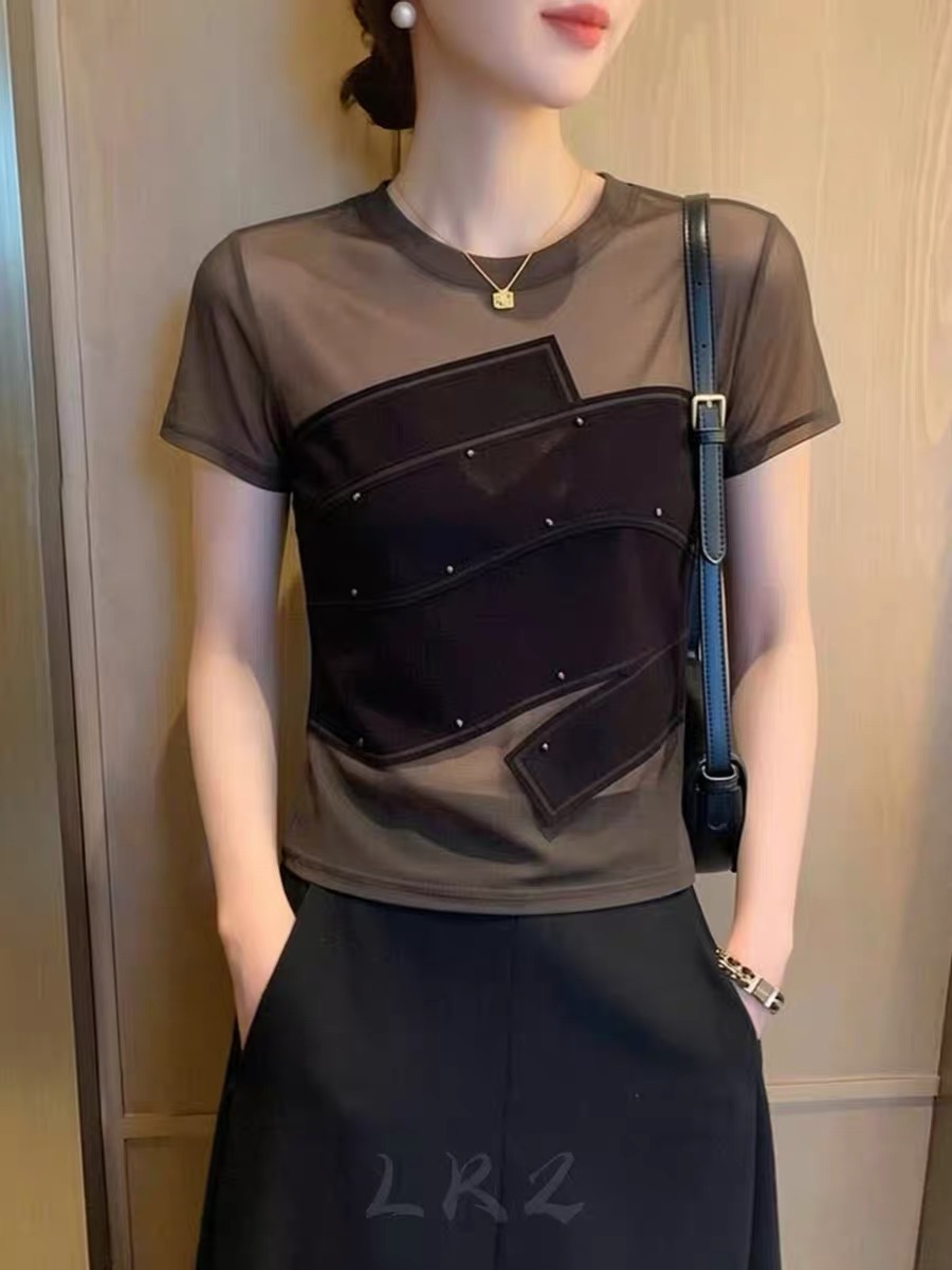 유럽 상품 고급 센스 브라운 핫픽스 튜브탑 패치워크 반팔 티셔츠 여름 새로운 작은 대중 디자인 세련된 맨위 여성