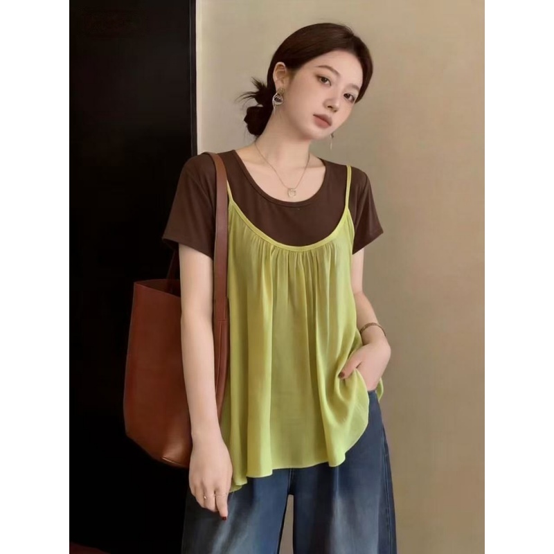 빅 사이즈 여성 의류 한 부서 연령 감소 디자인 짧은 티셔츠 여성 레트로 슬립 패치워크 사실 두 조각 통통한 여동생 맨위 여름