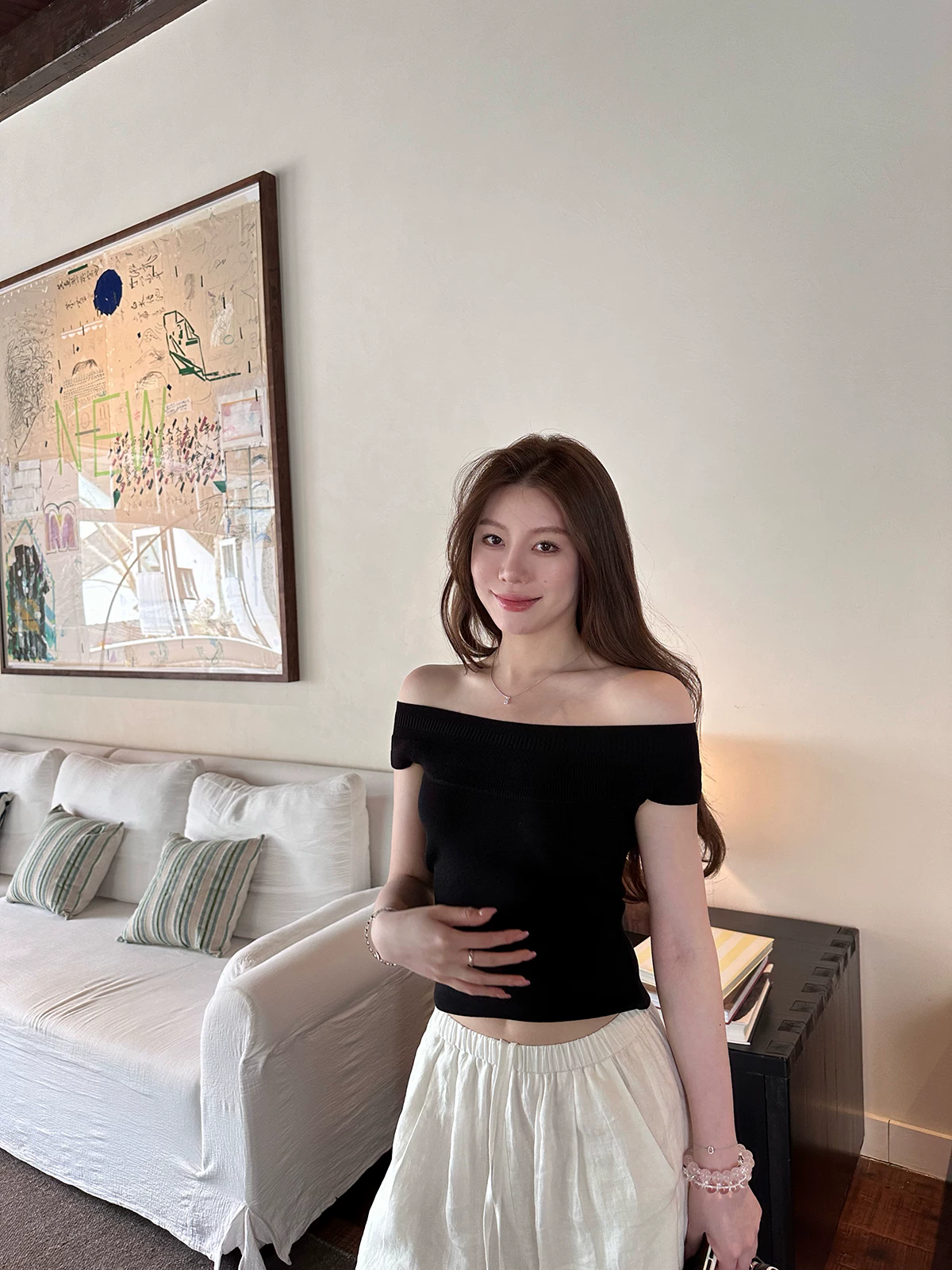 한 스타일 스트라이프 오프숄더 반팔 티셔츠 여성 몸매 가꾸기 슬림해 보이는 오프숄더 다용도 맨위 학원 스타일 스트라이프 맨위 여성