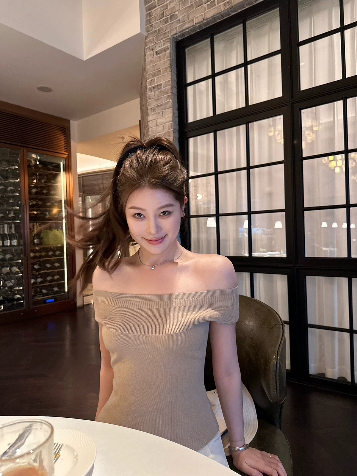 화이트 라운드 넥 긍정적 인 어깨 니트 반팔 티셔츠 여성 고유 한 아름다운 꼬집기 허리 오래된 돈 바람 착용 가져 가라. 수리