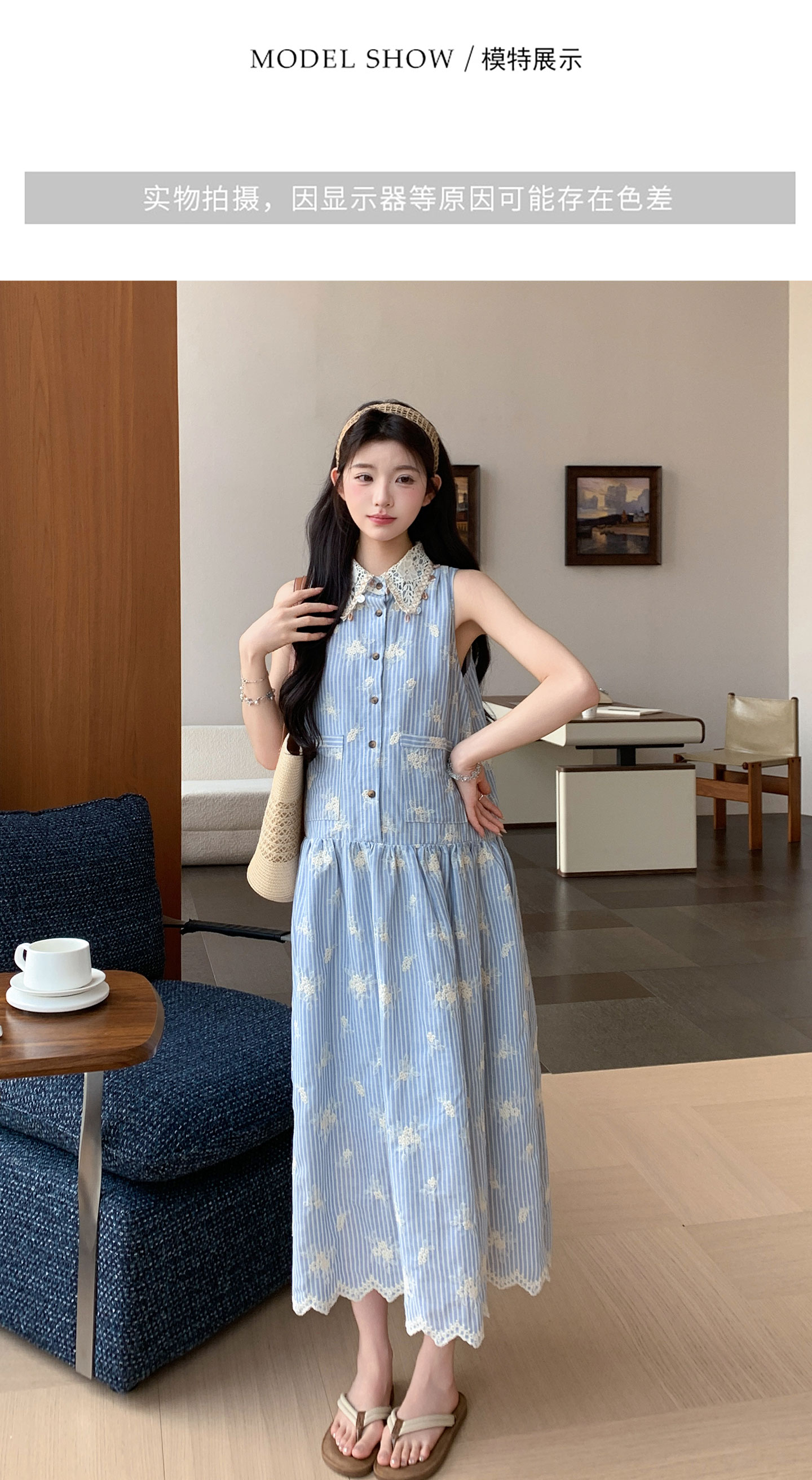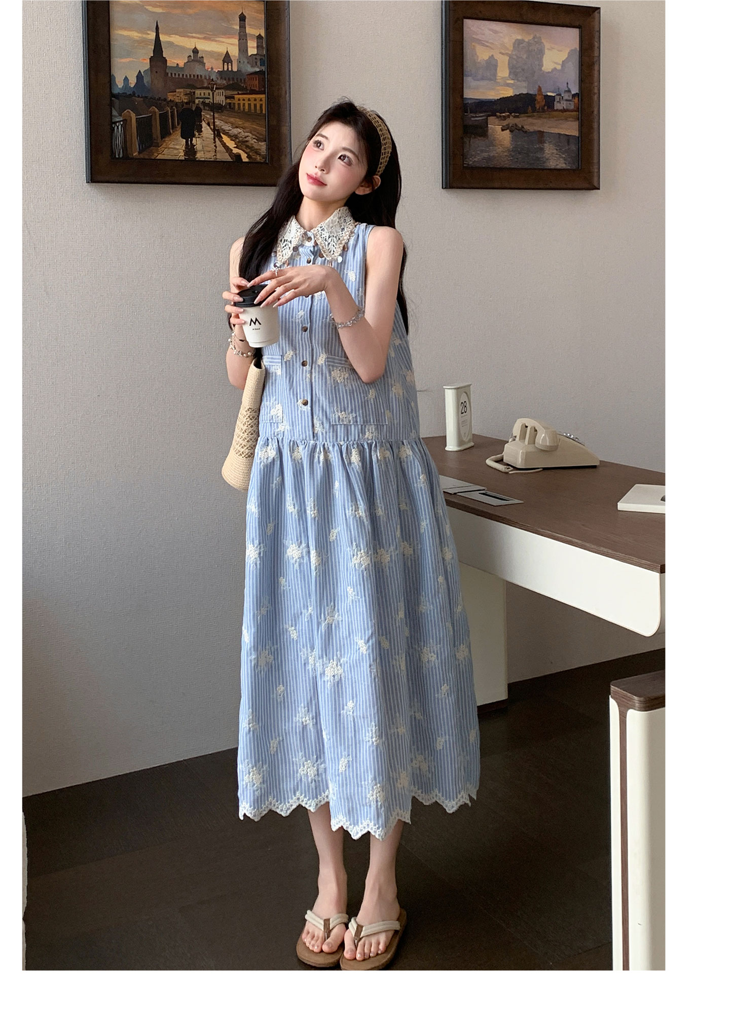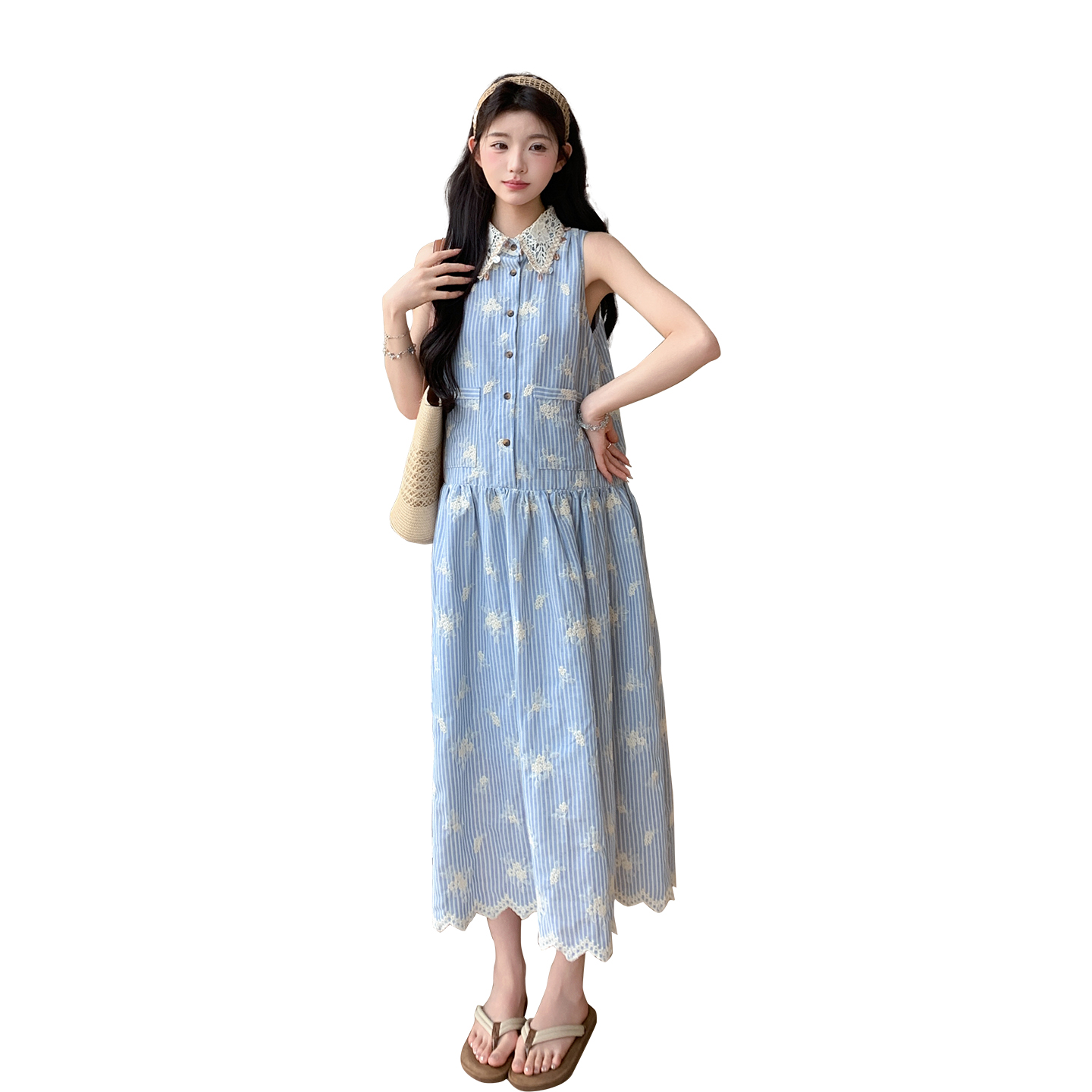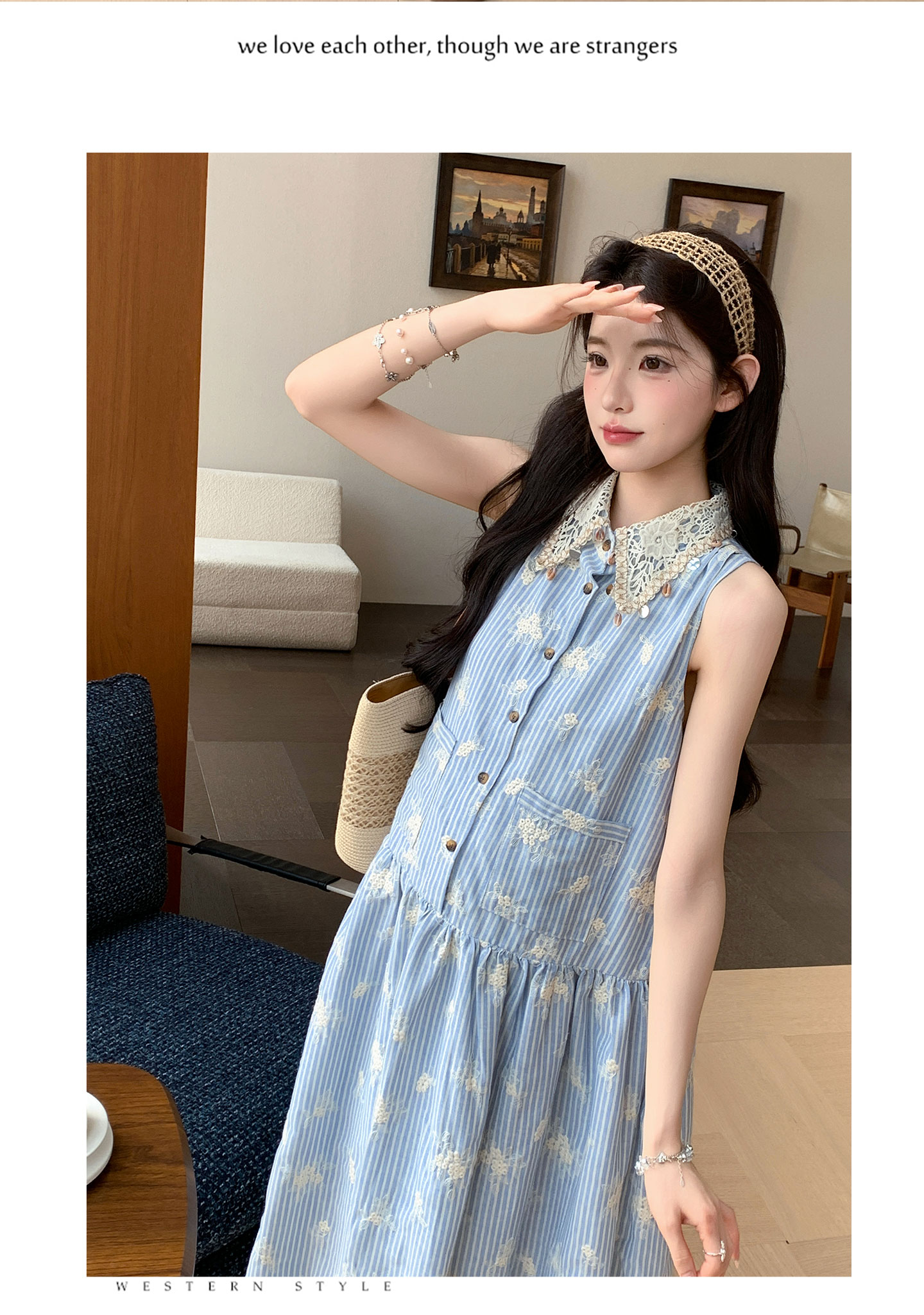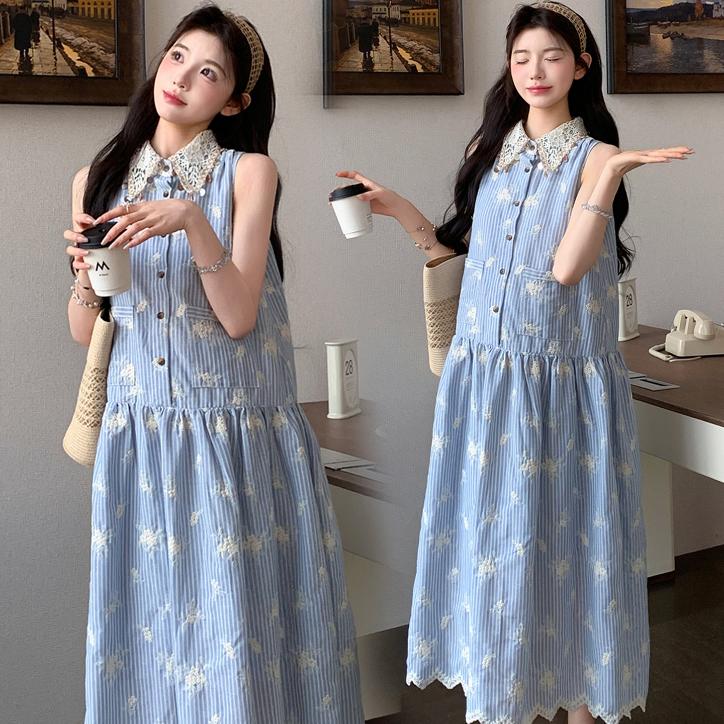 실사 지금 임산부 해변가 휴가 파란색 스트라이프 고급 센스 레이스 칼라 디자인 센스 아름다운 민소매 롱 스커트