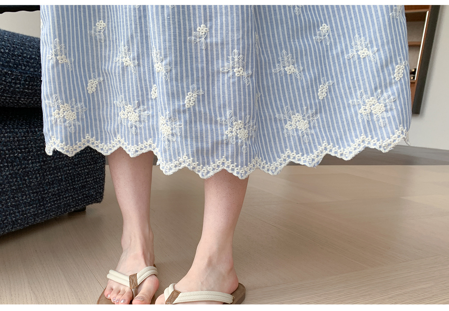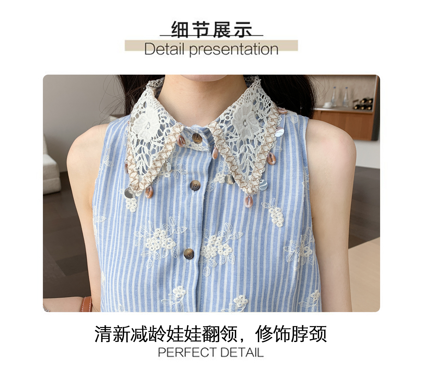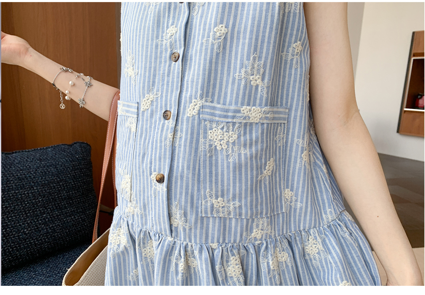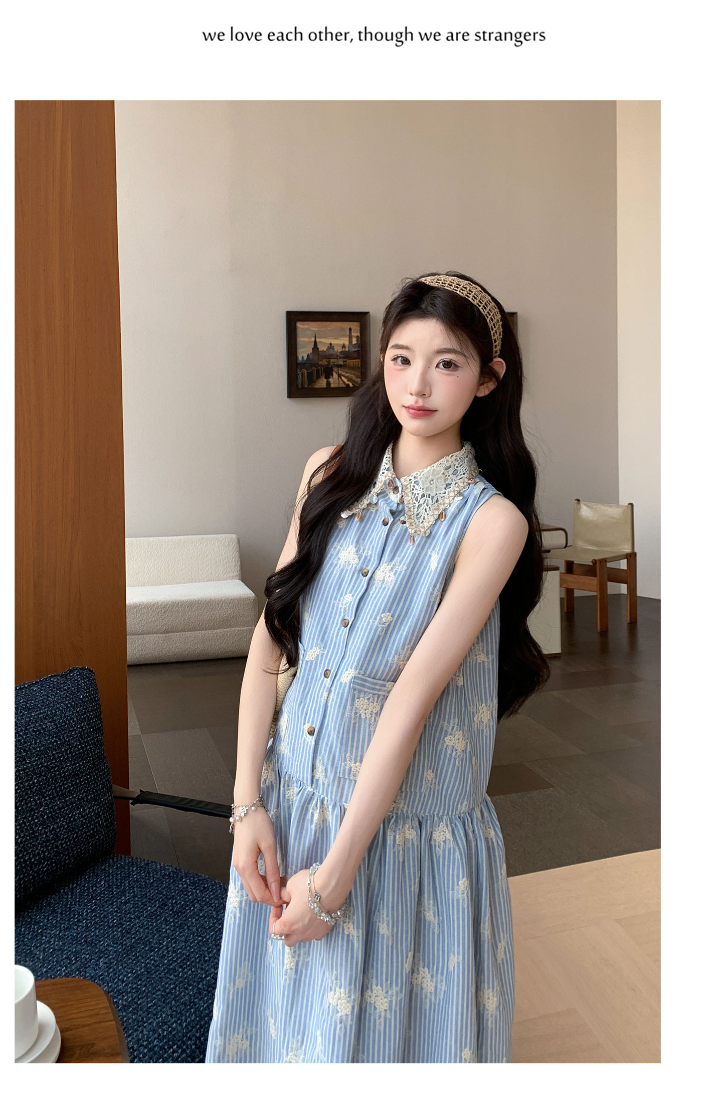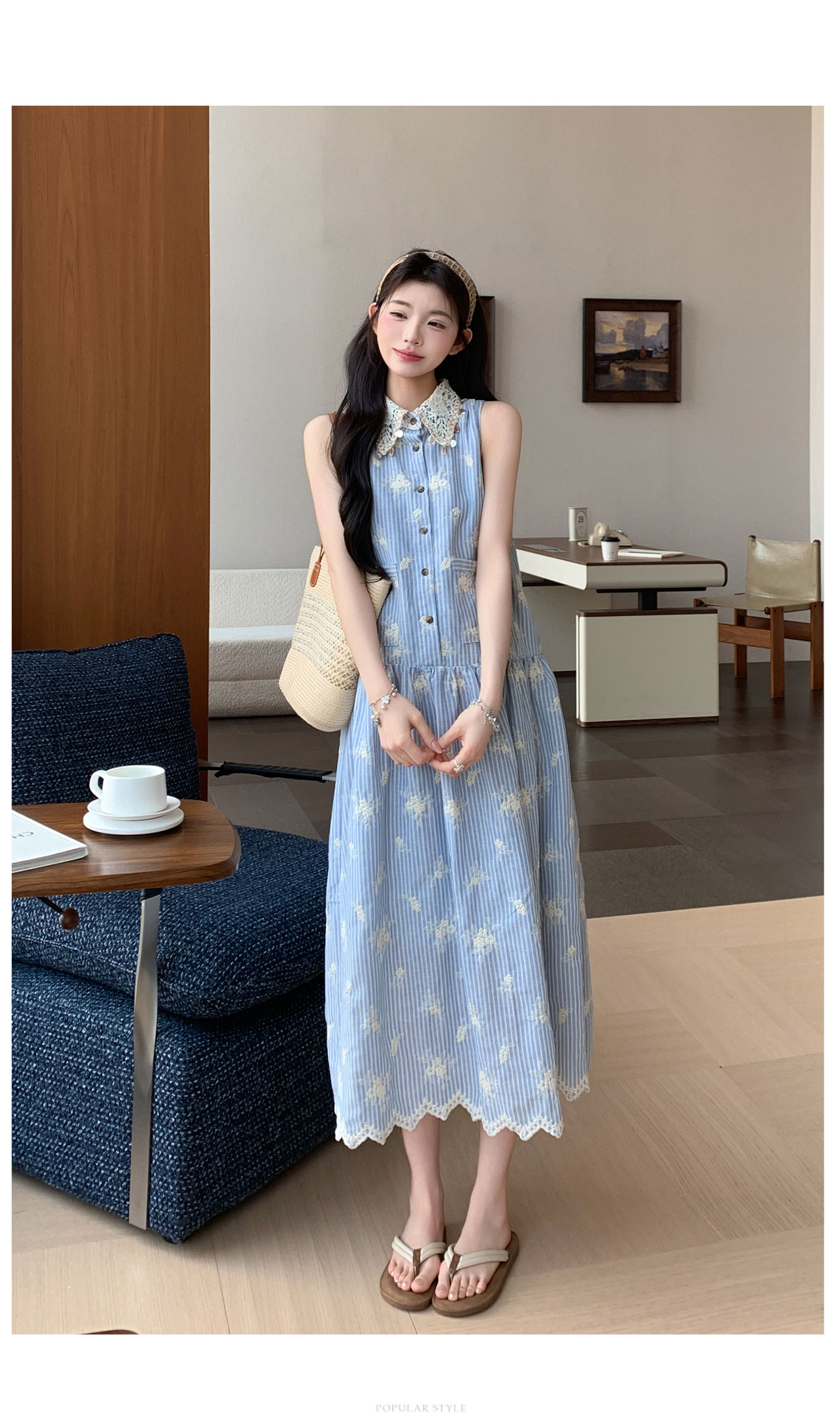 실사 지금 임산부 해변가 휴가 파란색 스트라이프 고급 센스 레이스 칼라 디자인 센스 아름다운 민소매 롱 스커트