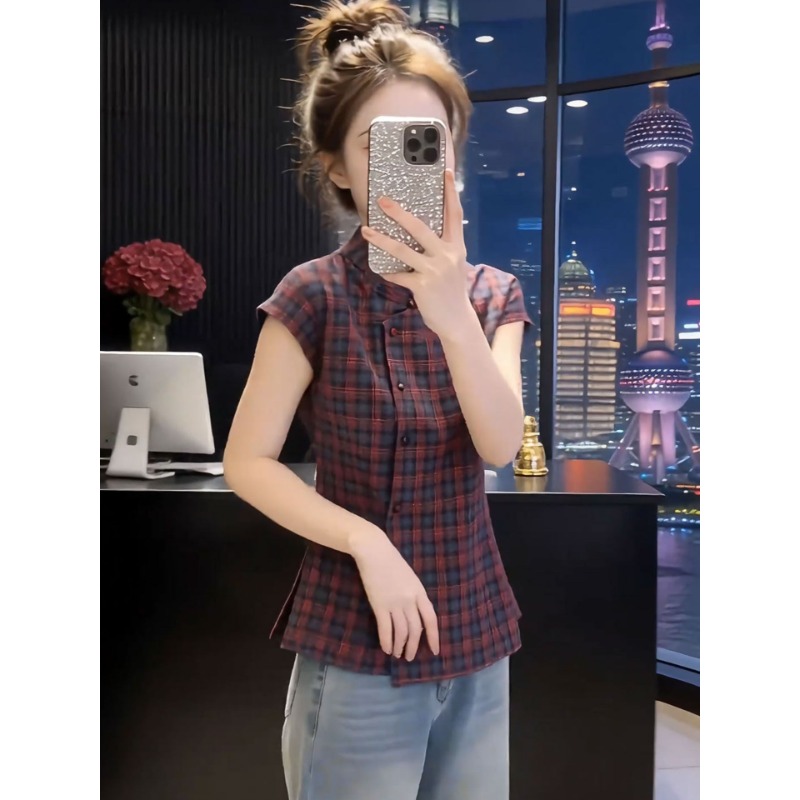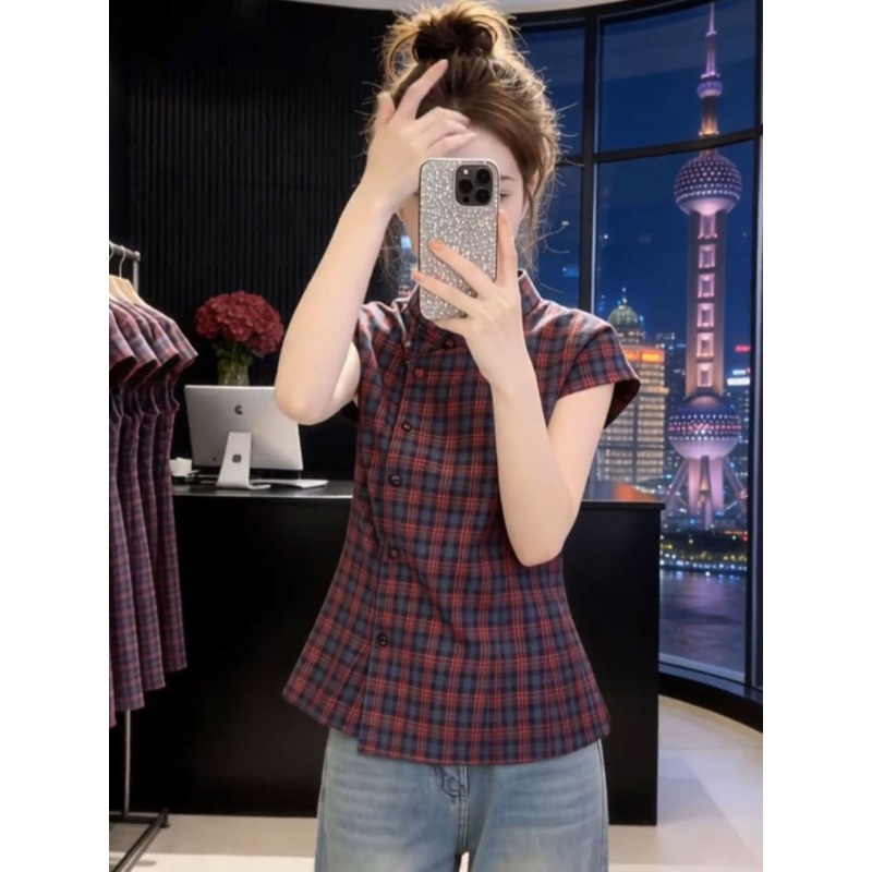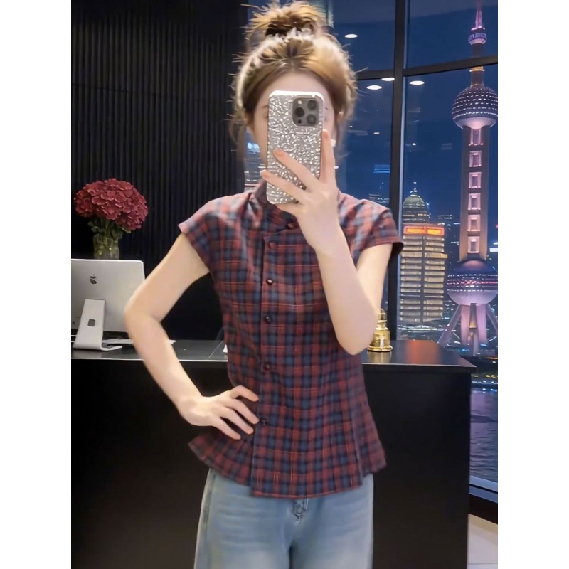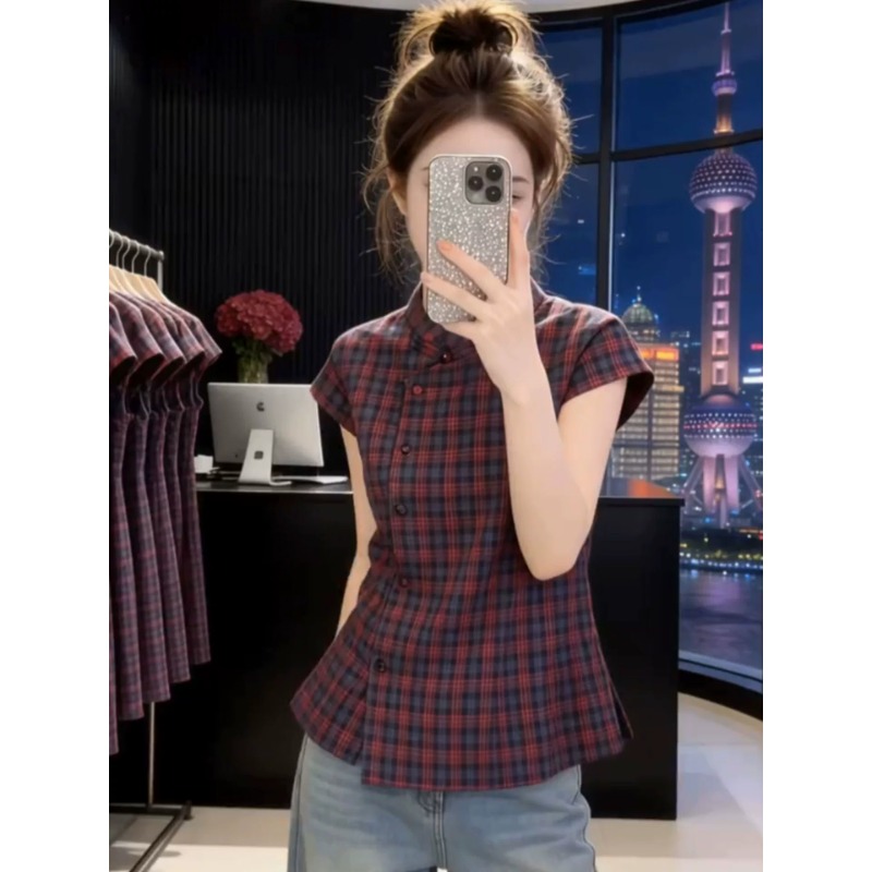 새로운 중식 레트로 체크무늬 반팔 셔츠 여자 2026 여름 새로운 디자인 센스 작은 대중 품격 슬림해 보이는 맨위