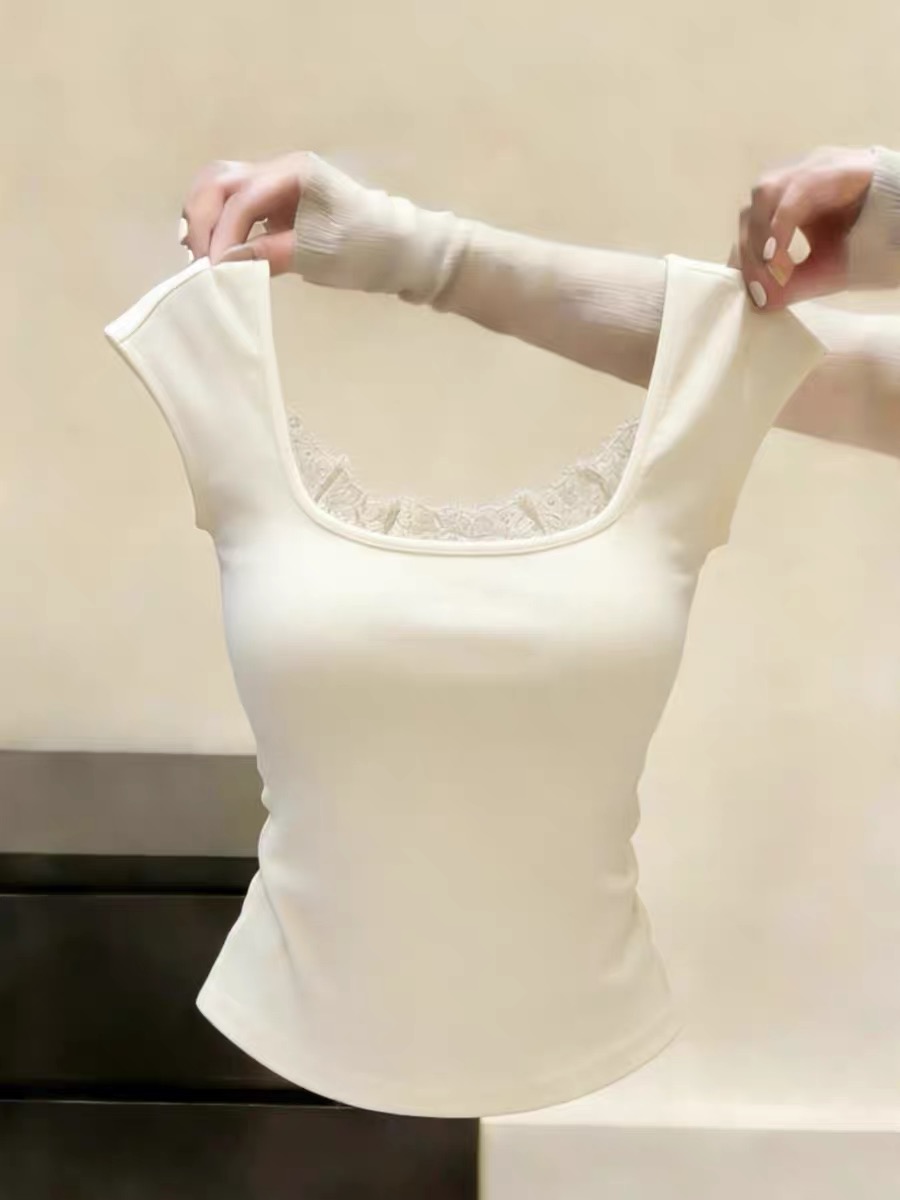 프랑스식 절묘한 아름다운 쌀 화이트 칼라 레이스 측면 민소매 어깨 여성 여름 새로운 몸매 가꾸기 슬림해 보이는 연령 감소 맨위