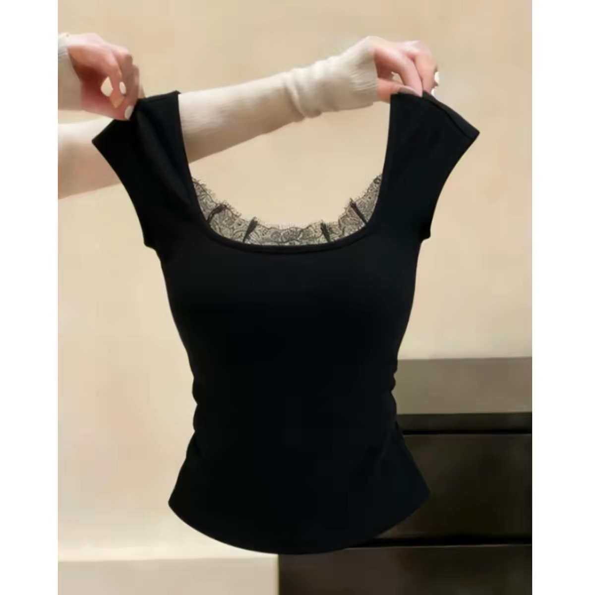 고유 한 아름다운 검정색 레이스 측면 광장 칼라 반팔 티셔츠 여성 여름 새로운 외국 가스 다용도 슬림해 보이는 쇼트 스타일 맨위