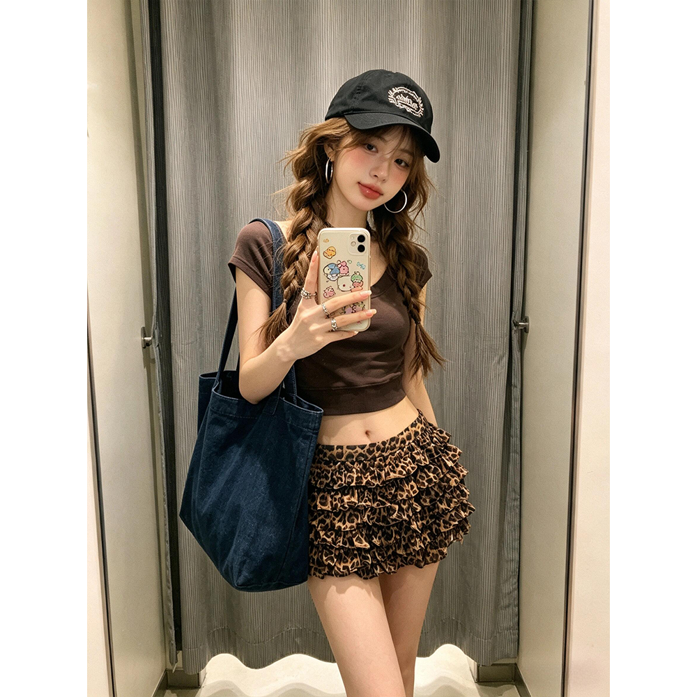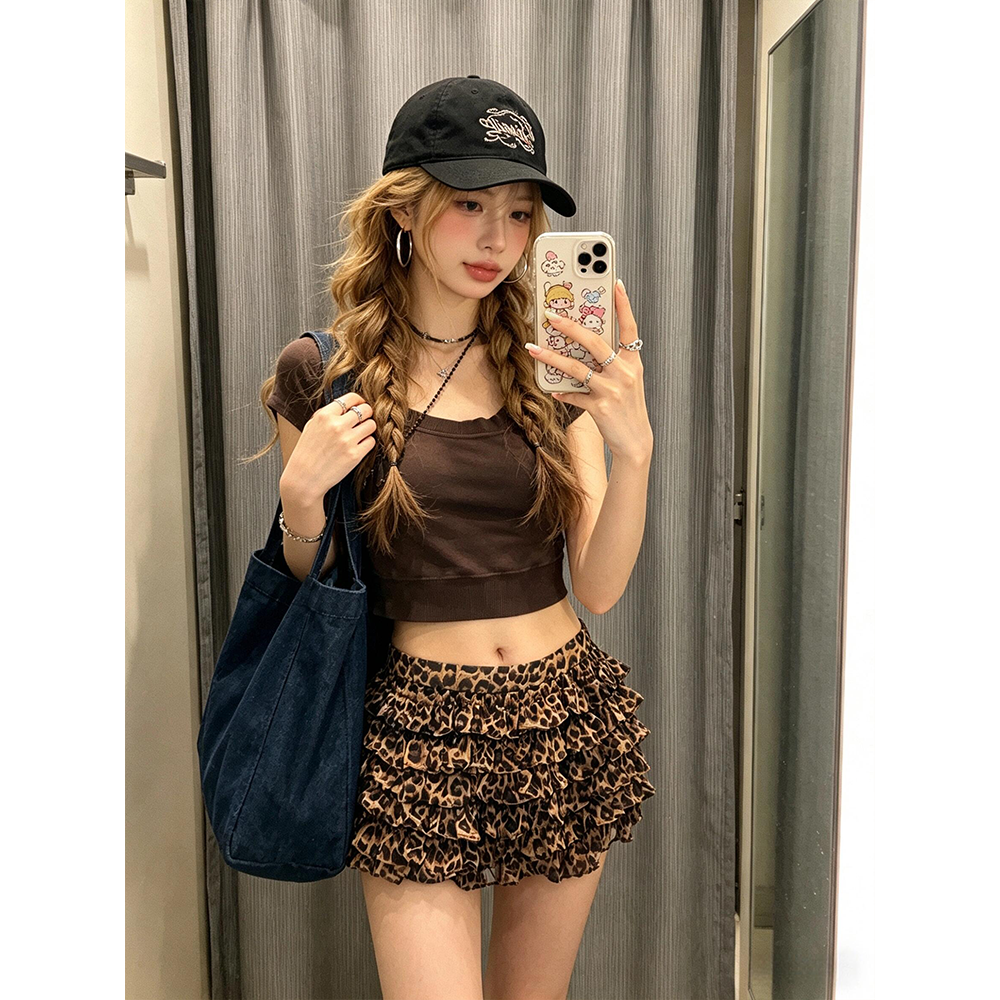 정가 재고 있음 아메리칸 핫걸 바람 오프숄더 반팔 티셔츠 맨위 여성 여름 새로운 레오파드 무늬 반신 치마 세트