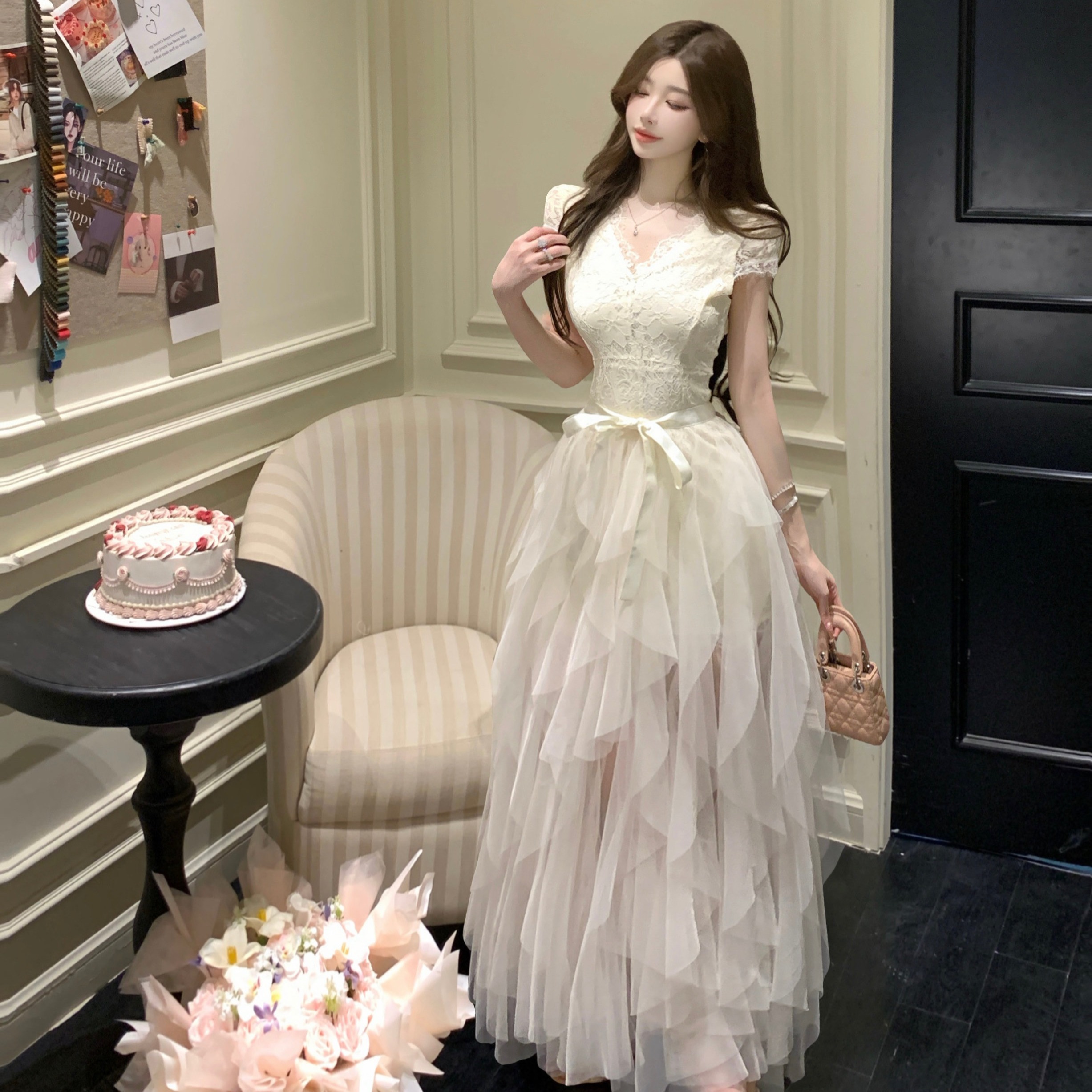실사 프랑스식 숲속 소녀 품격 섹시함 바람 망사 패치워크 이슬 허리 디스플레이 허리 꽃 드레스 타이트 스커트