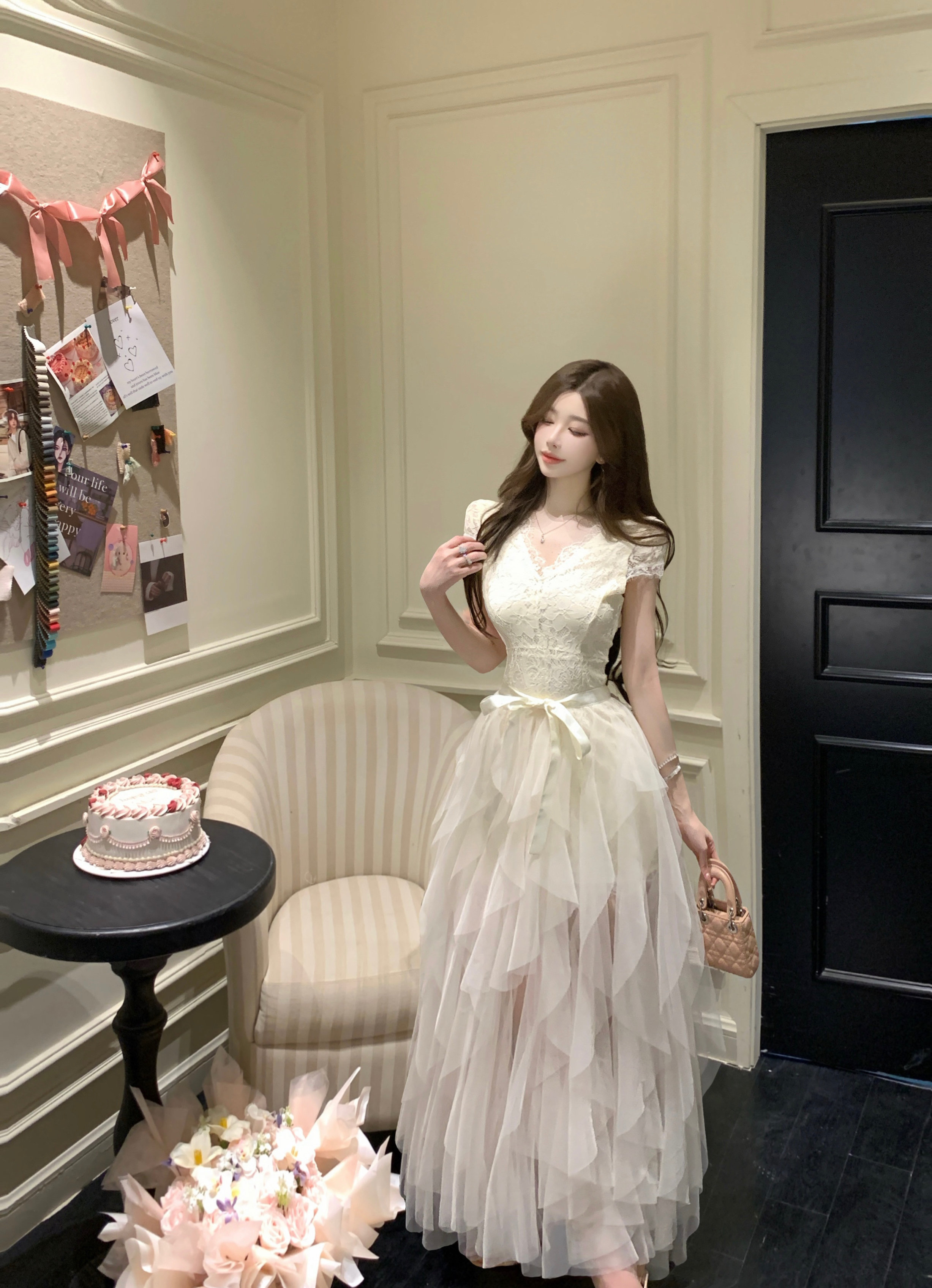 실사 핫걸 순수한 욕망 바람 오프숄더 드레스 디자인 센스 망사 시스루 품격 아름다운 허리 수축 타이트 스커트 롱 스커트