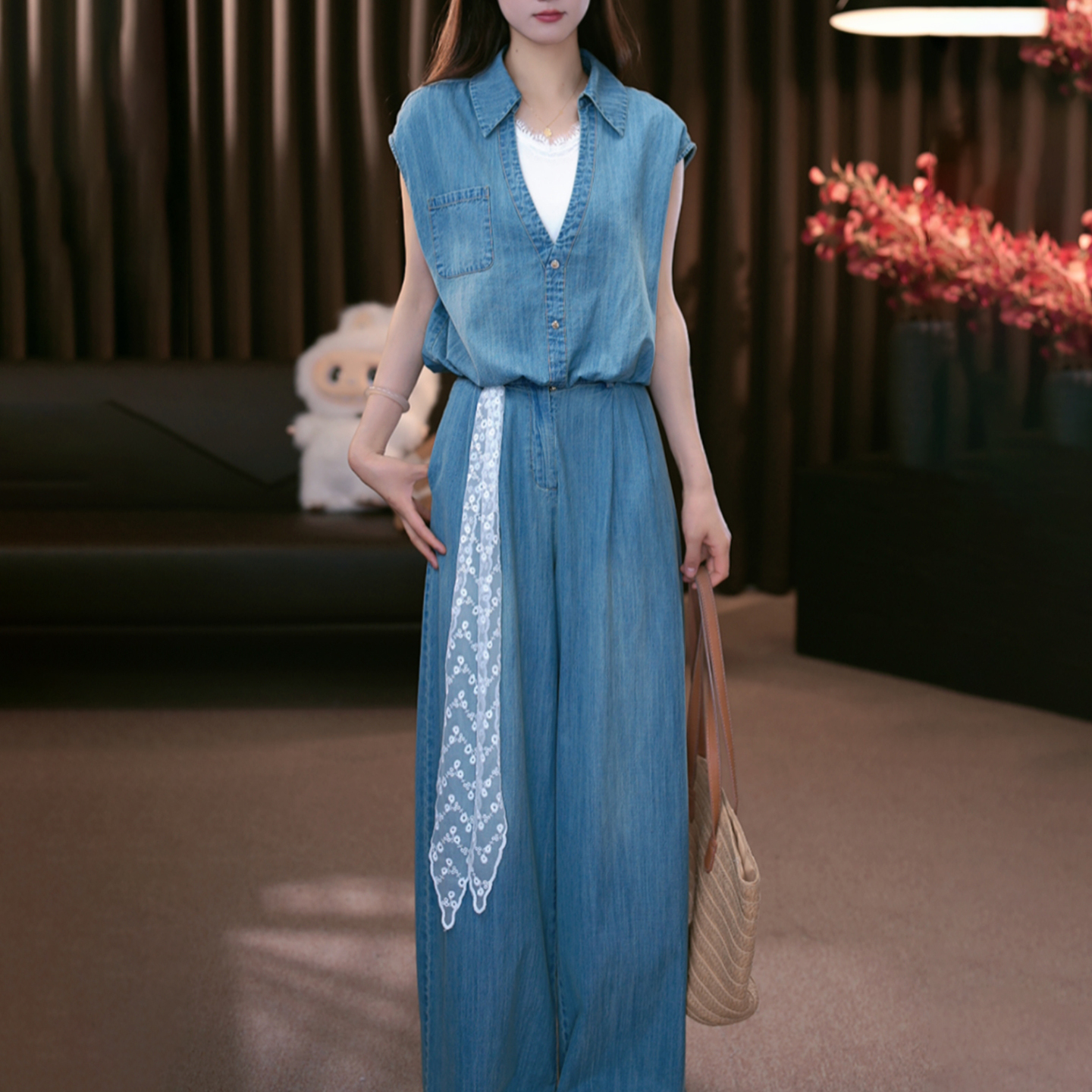 경관 그림 연령 감소 캐주얼 품격 맨위 와이드 레그 팬츠 리본 세트 여름 품격 세련된 3종 세트 ootd 착용 가져 가라.