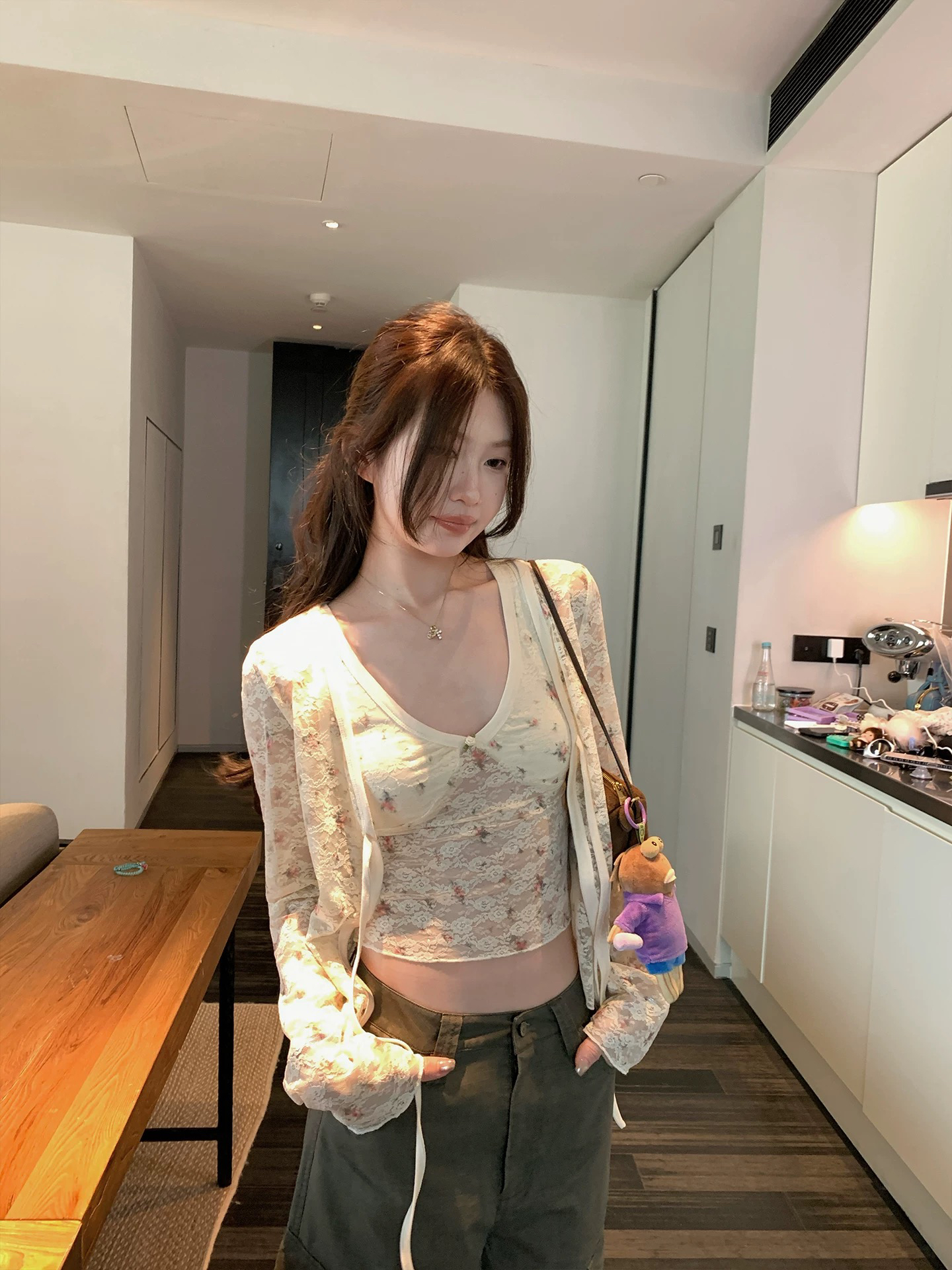 opening 직접 만든 부드러운 bunny 레이스 꽃무늬 V넥 조끼 레이스업 오픈 가디건 세트 그룹