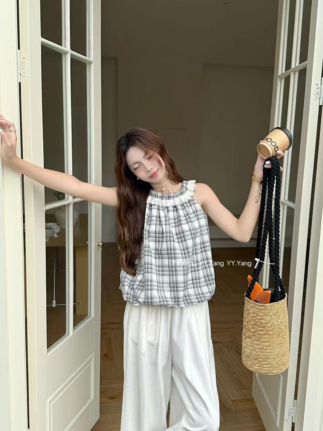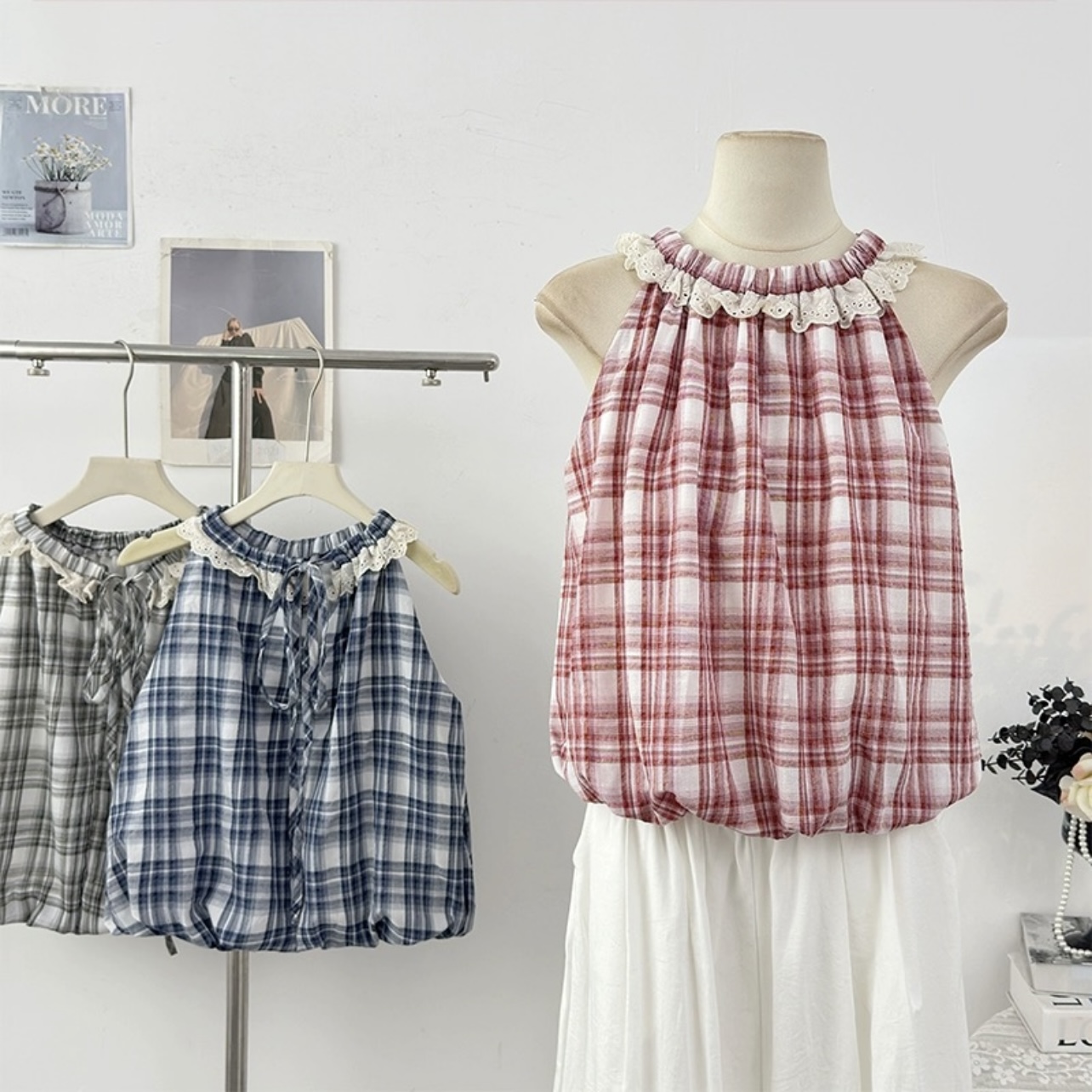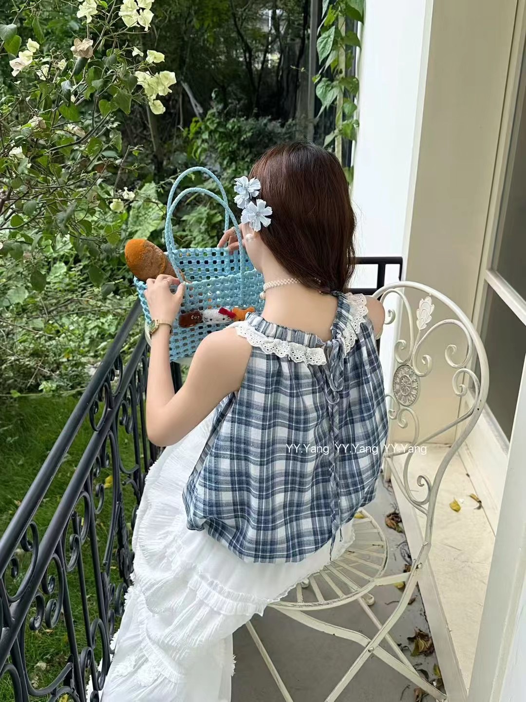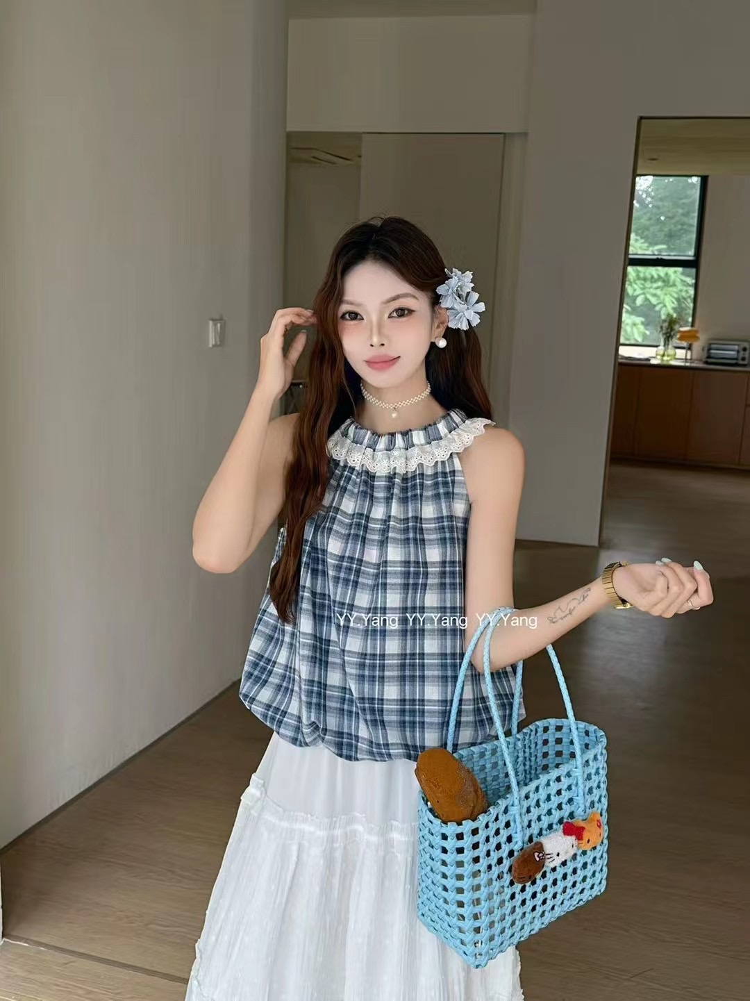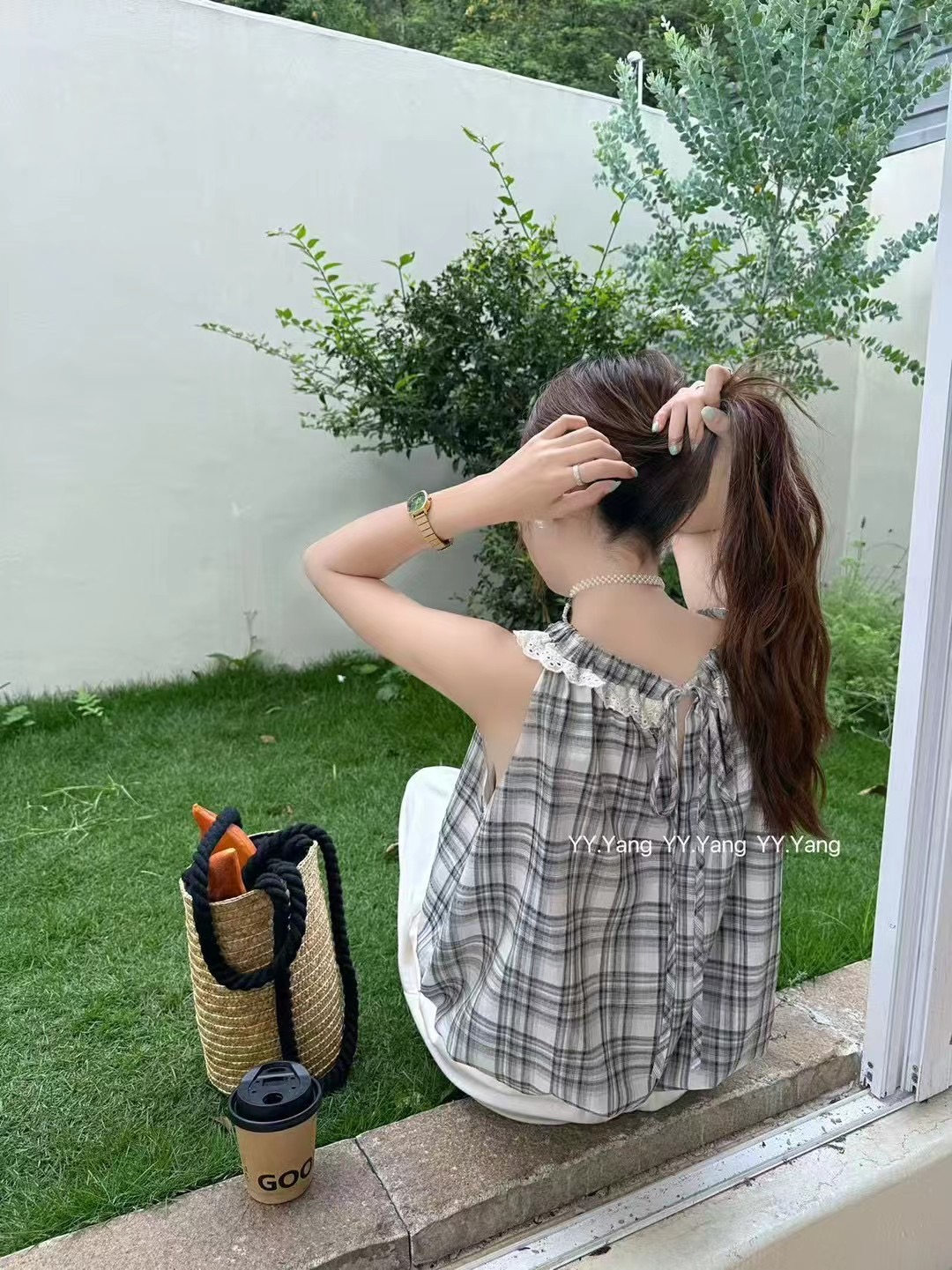 한 부서 달콤함 레이스 조각 행침 목 오프숄더 체크무늬 조끼 여성 봄 2026 패션 허리 수축 슬림해 보이는 꽃밭 맨위