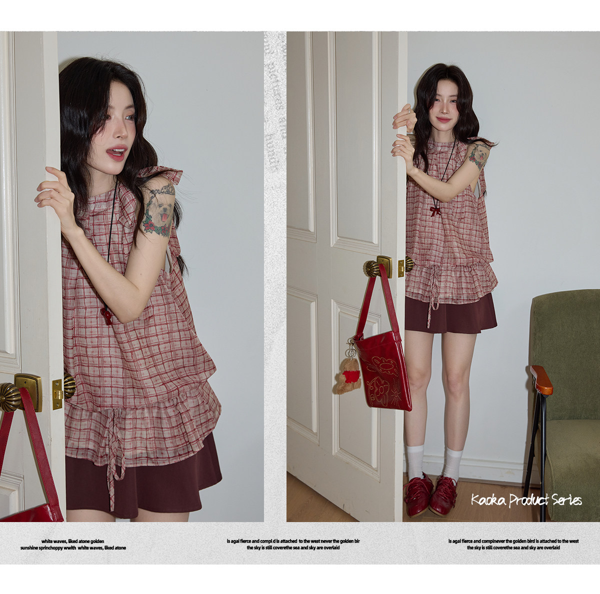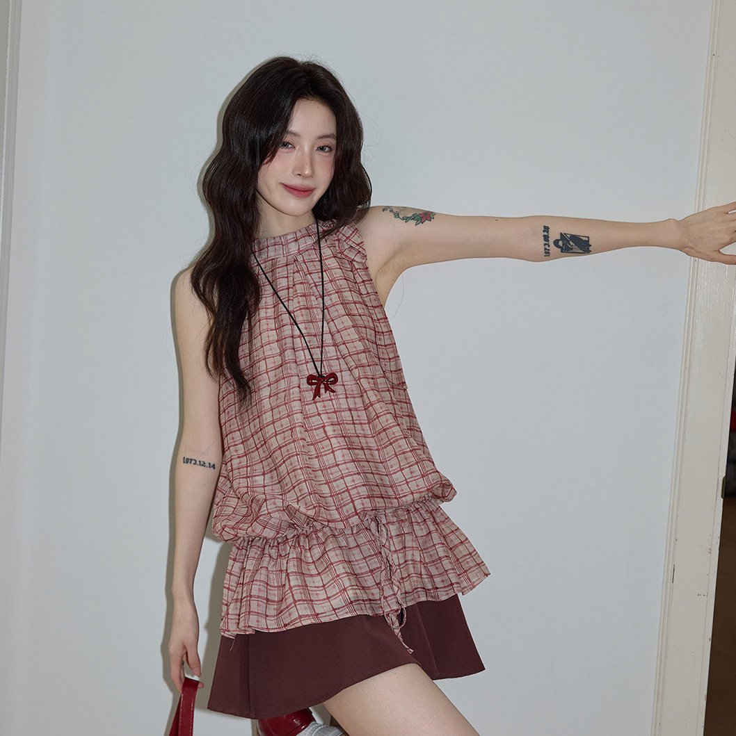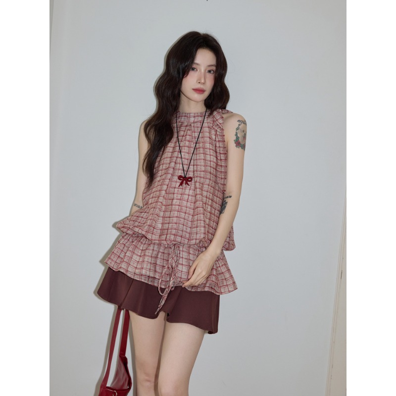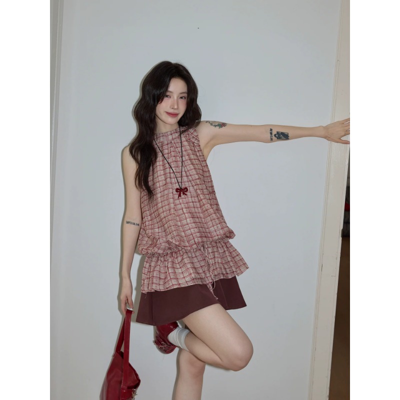 시끄러운 홈 디자인 센스 빨간색 체크무늬 행침 목 민소매 맨위 여성 여름 고급 셔츠 펌프 로프 프릴 셔츠
