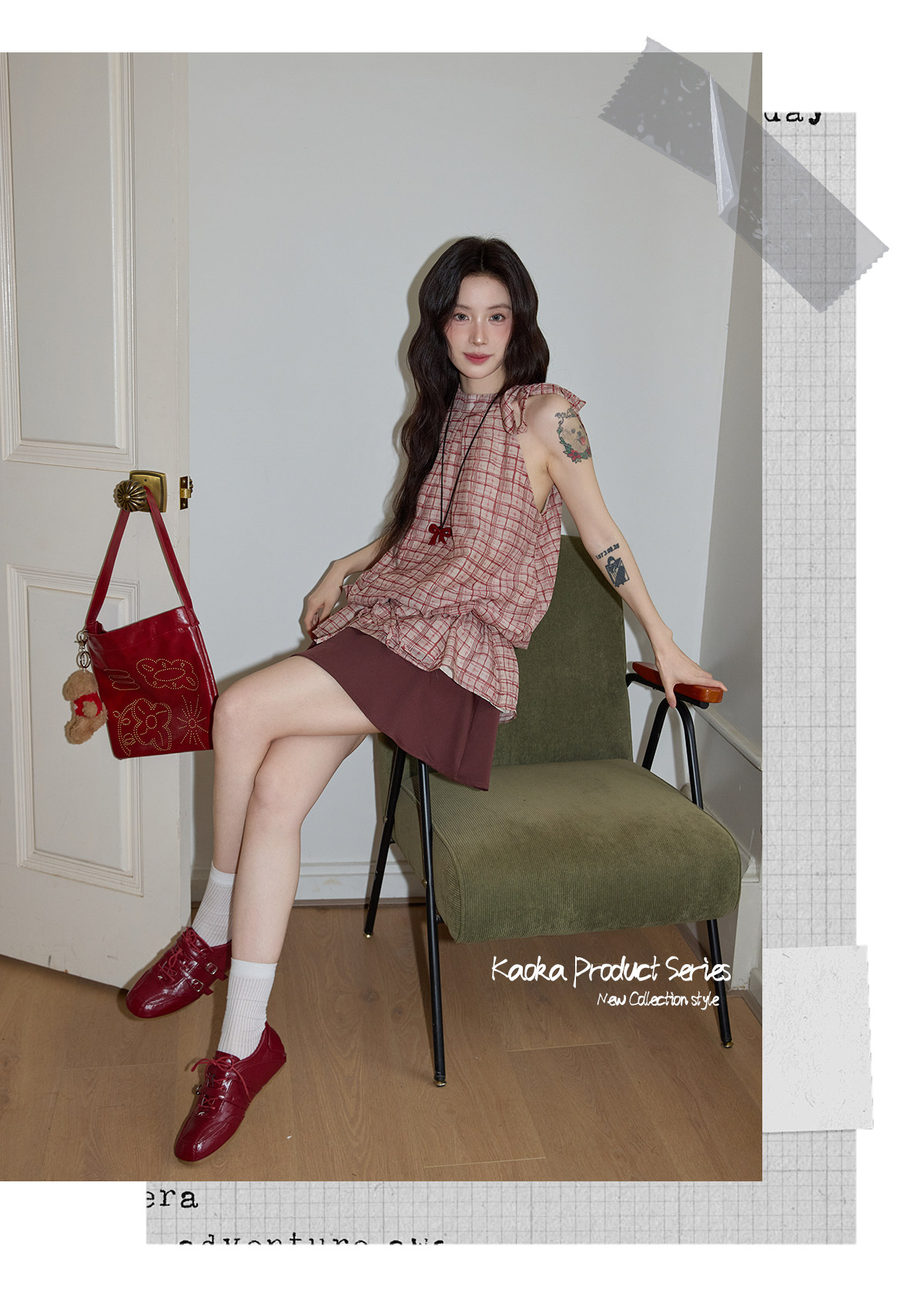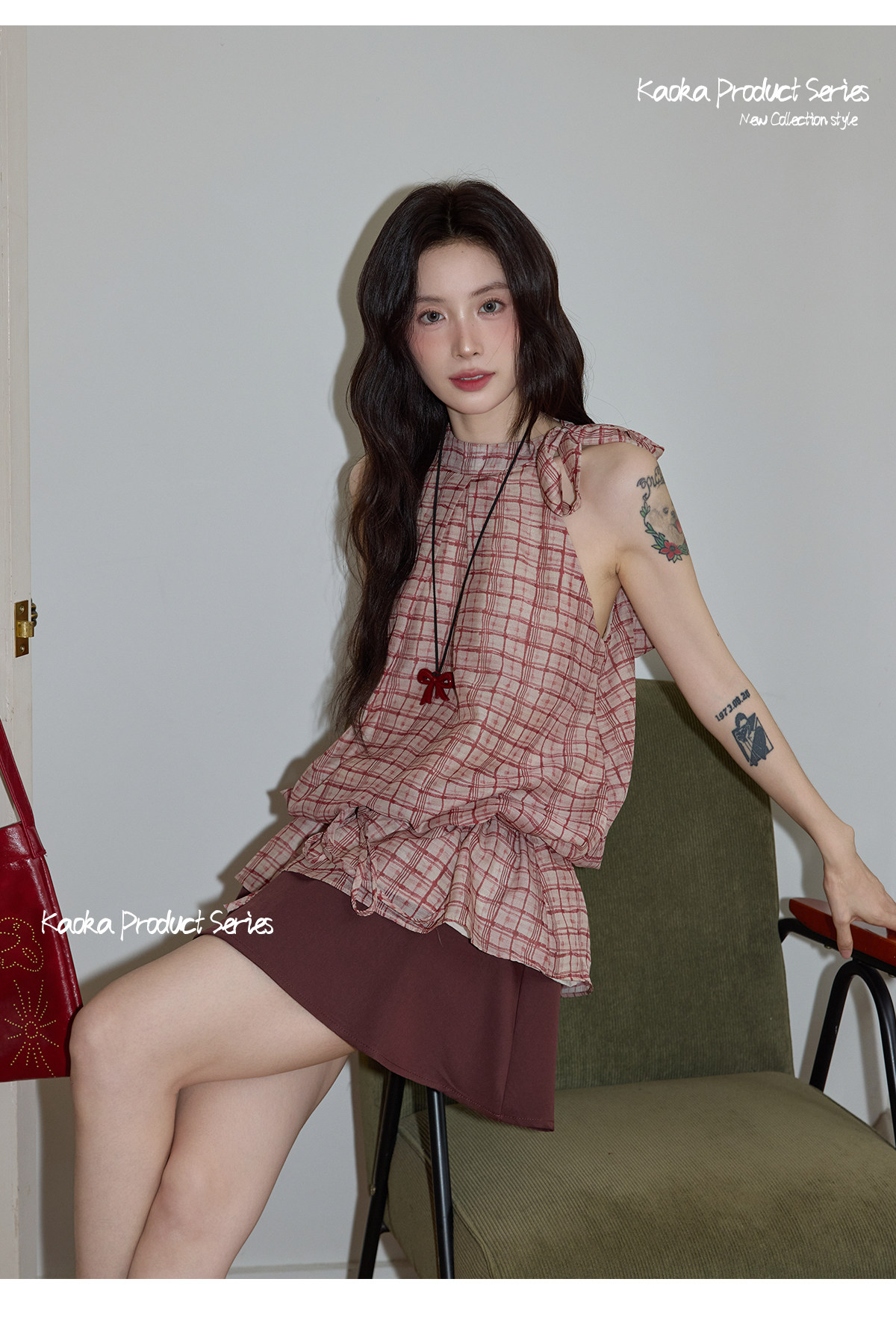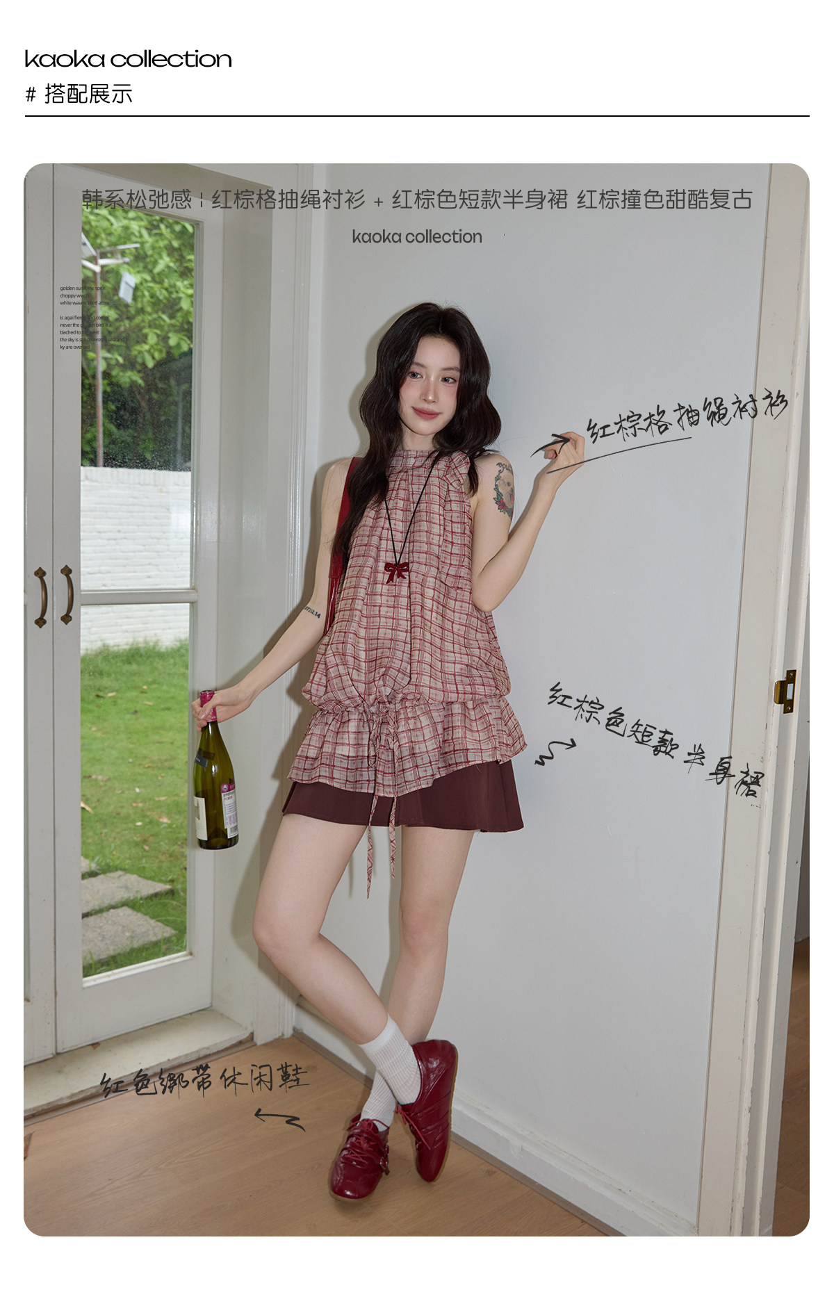 시끄러운 홈 디자인 센스 빨간색 체크무늬 행침 목 민소매 맨위 여성 여름 고급 셔츠 펌프 로프 프릴 셔츠