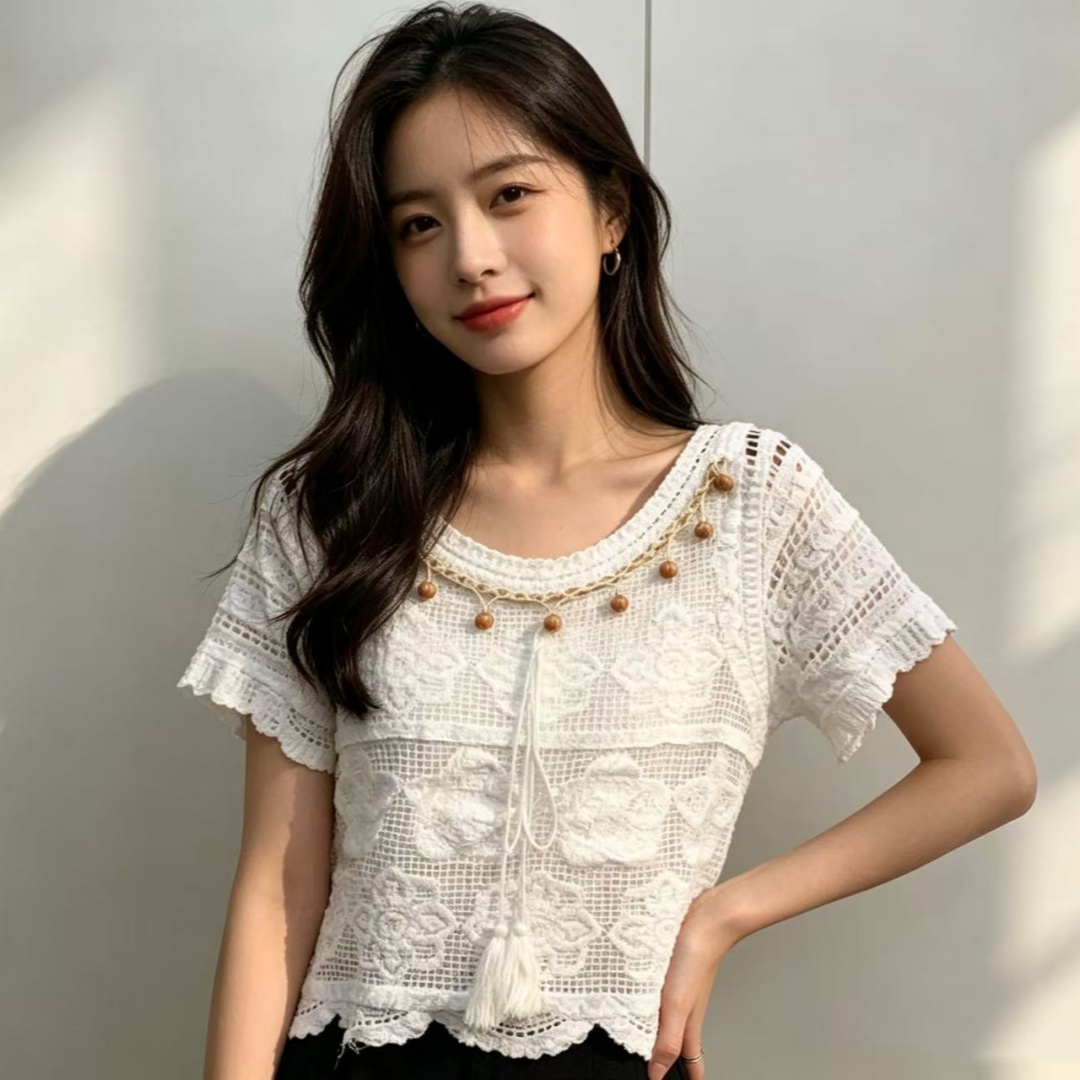 2026 여름 새로운 자수 홀로우 아웃 무거운 작업 구슬 조각 자수 레이스 베스트 다용도 반팔